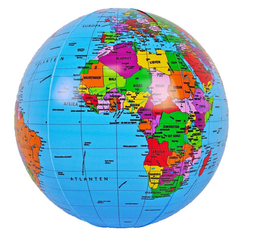 Uppblåsbar jordglob med politisk kartbild som visar länder i tydliga färger. 68cm i diameter, svensk text.