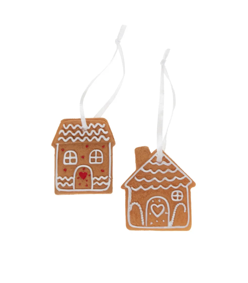Joulukoriste piparkakkutalo, pakkaus sisältää 2kpl eri näköistä koristetta, koko 4,5×0,9×5,4cm. Pakattu pahvirasiaan, jossa kirkas kansi. Materiaali muovi.