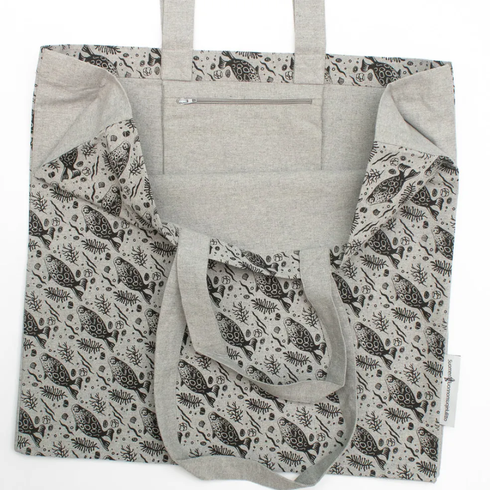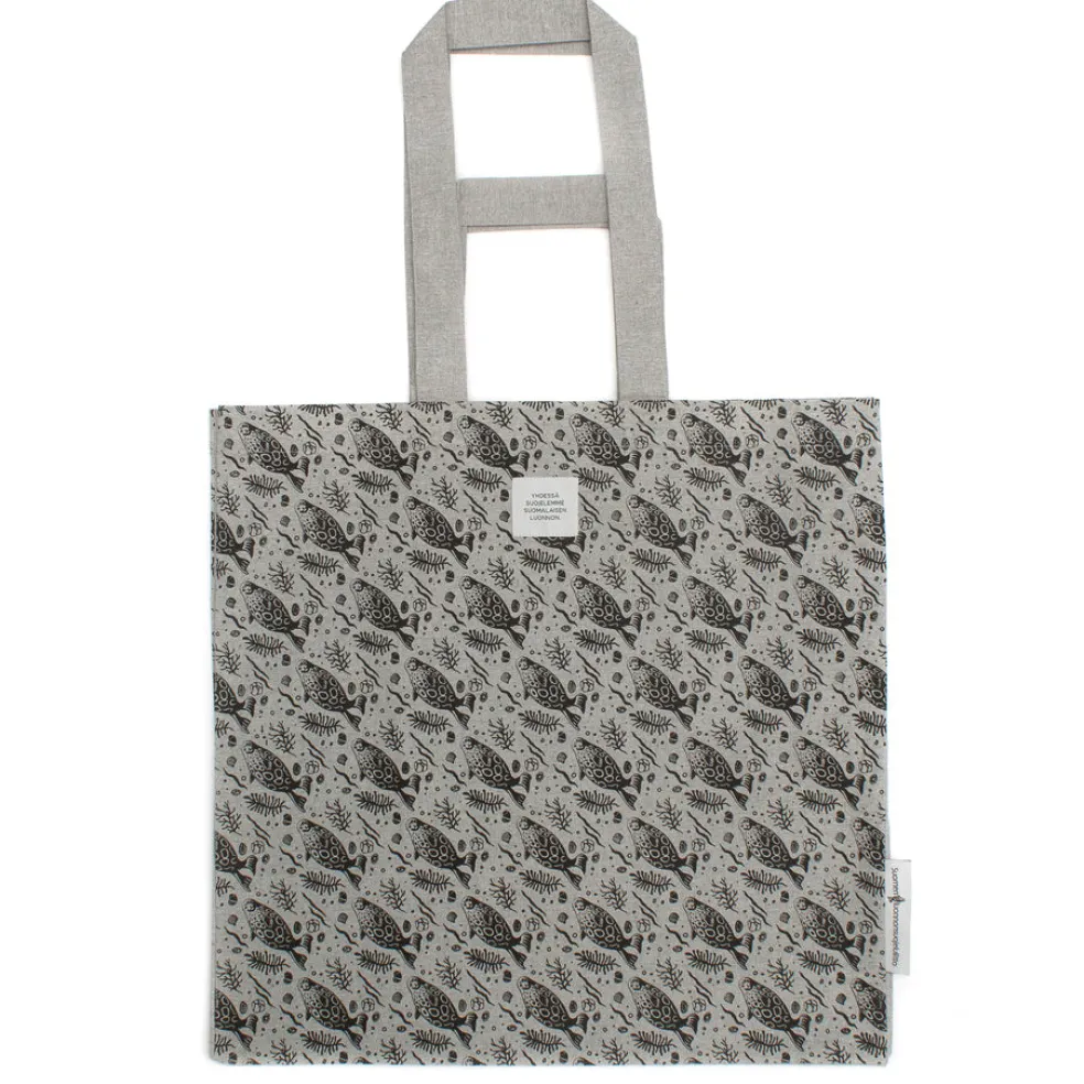 Tilavassa Pinnan alla -kangaskassissa saat kuljettua monenlaiset tavarat, oletpa sitten menossa hiekkarannalle tai lähikauppaan.