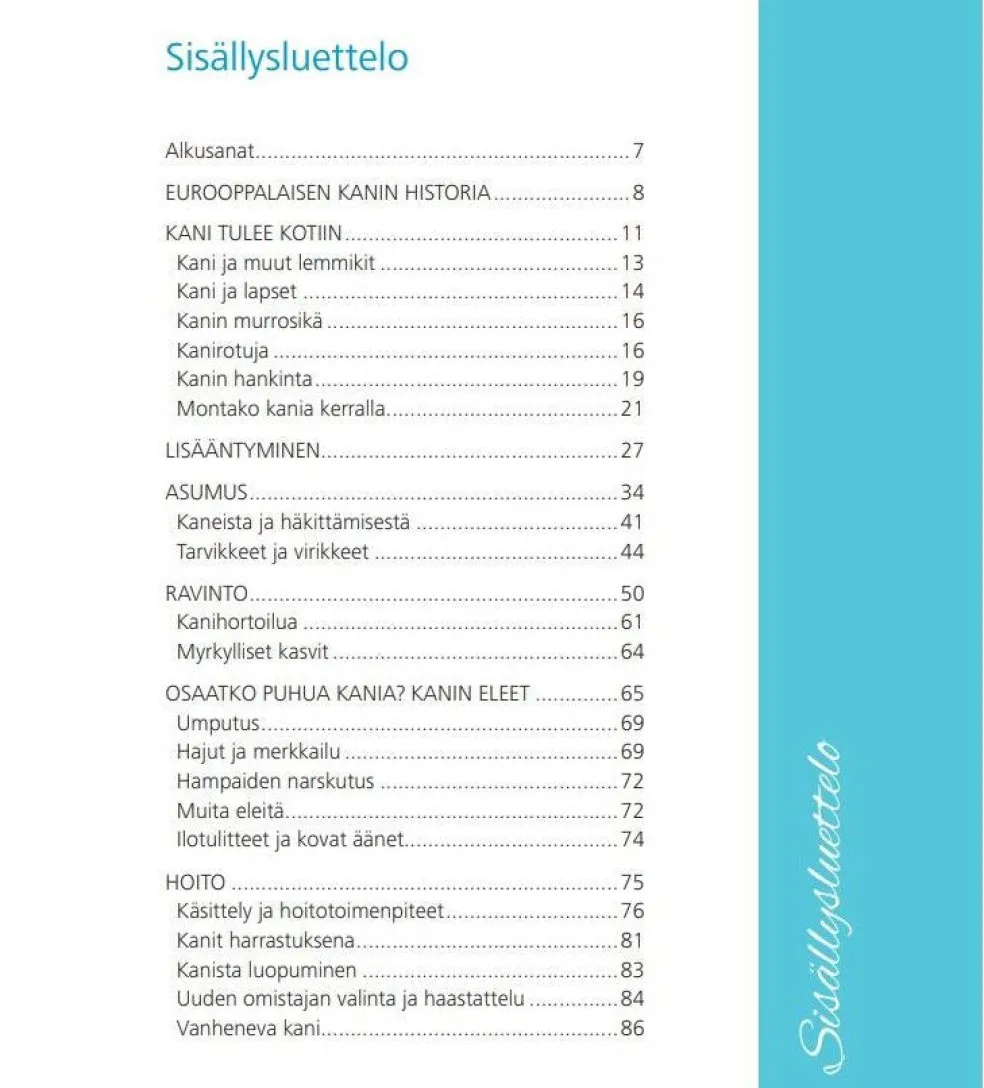 Mitä tarkoittaa, kun kani narskuttelee? Miksi kani heittäytyy kyljelleen? Miksi kani puree ja mitä sille voi tehdä? Mitä kasveja voin kerätä kanille luonnosta? Mm. näihin löytyy vastauksia Kanikirjasta.