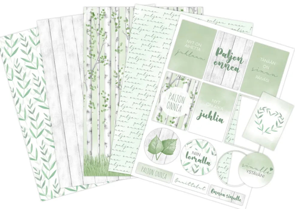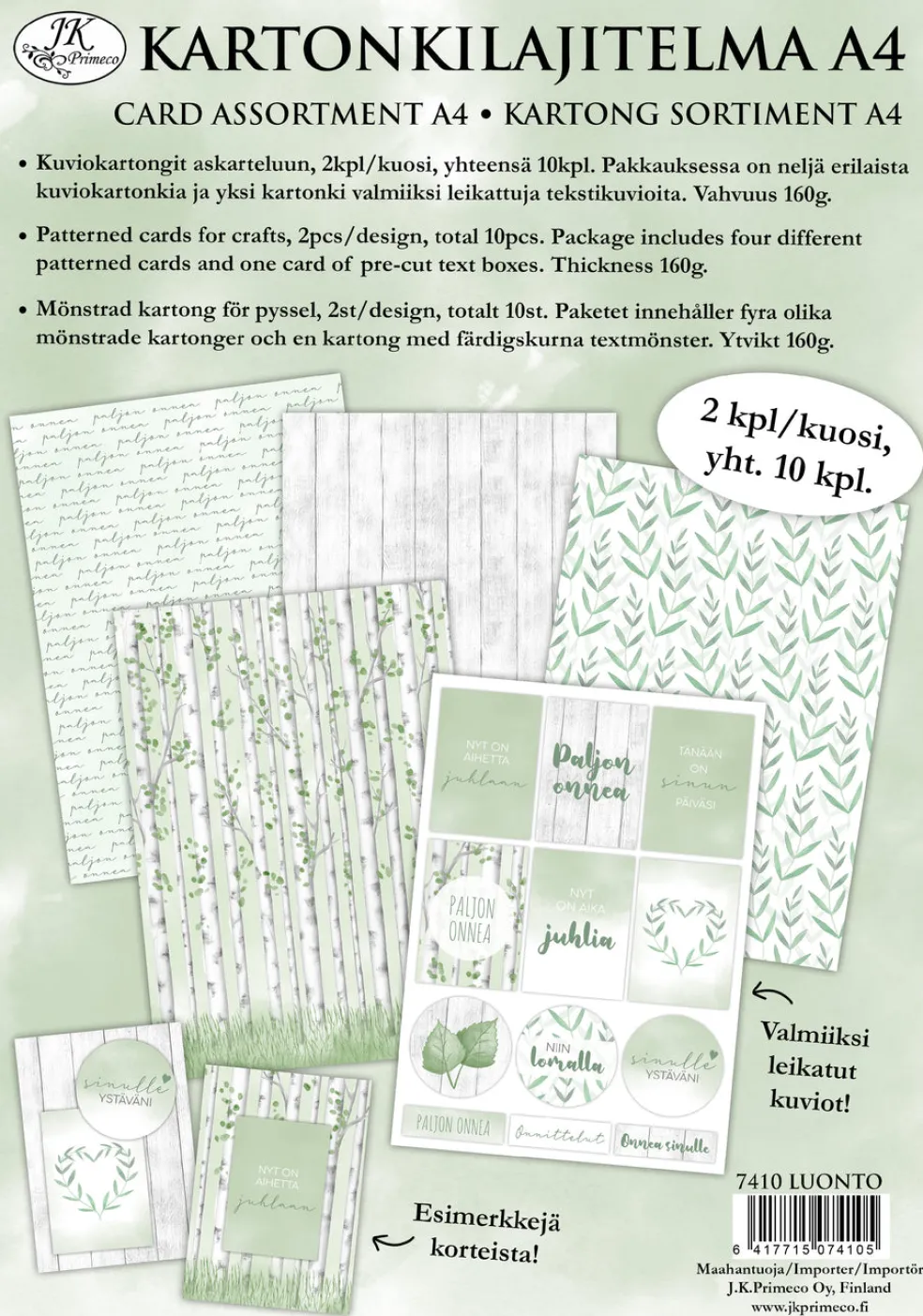 Kartonkilajitelma askarteluun ja koristeluun. Pakkaus sisältää kahdeksan arkkia A4-kokoisia kuviokartonkeja sekä kaksi A4-kokoista arkkia valmiiksi leikattuja kartonkisia tekstikuvioita. Pakkauksessa on neljä erilaista kuviokartonkia, kaksi kappaletta per kuosi. Kartongin vahvuus on 160g/m².