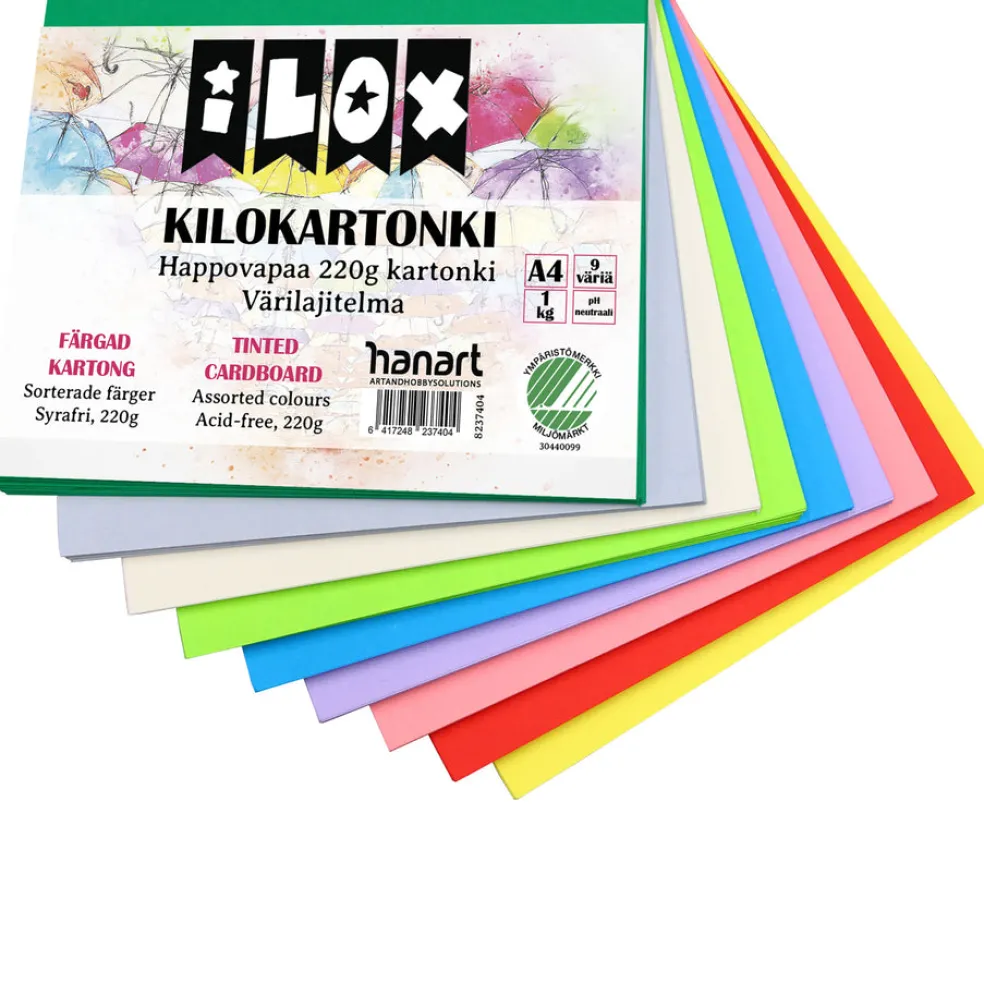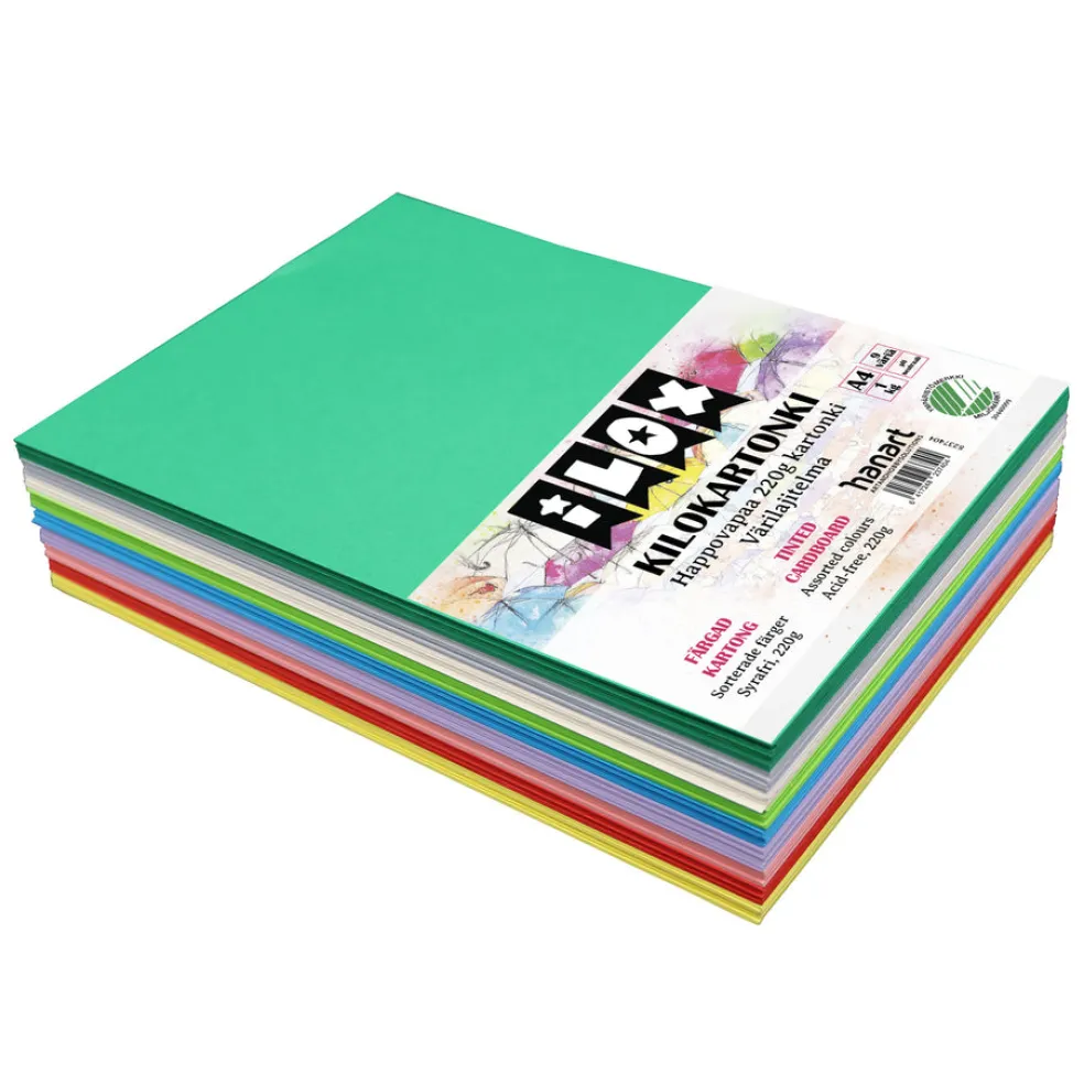 Happovapaa askartelukartonki 220g. Värit keltainen, punainen, vaaleanpunainen, vaalea lila, kirkkaansininen, vaalean vihreä, metsänvihreä, kerma ja vaaleanharmaa
