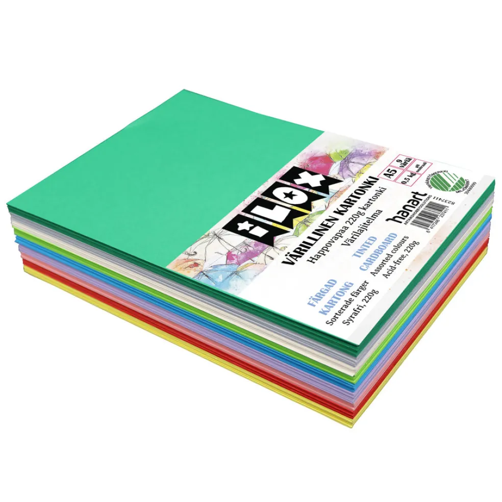 Happovapaa askartelukartonki 220g. Värit keltainen, punainen, vaaleanpunainen, vaalea lila, kirkkaansininen, vaalean vihreä, metsänvihreä, kerma ja vaaleanharmaa