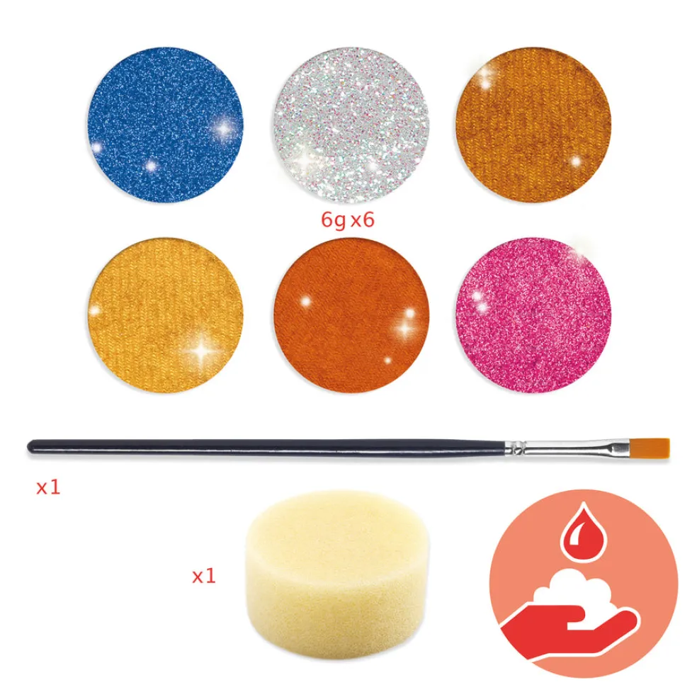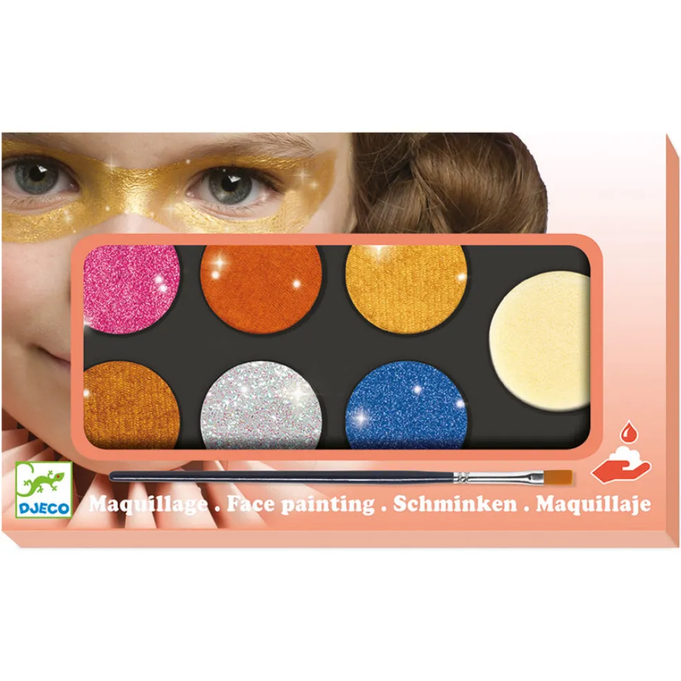 Djecon kasvovärissä on kuusi kimaltelevaa väriä. Väreissä on hyvä pigmentti ja ne ovat dermatologisesti testattuja. Paketissa on myös pensseli ja sieni, joilla maaleja voi levittää. Hajusteeton, ei sisällä parabeeneja.