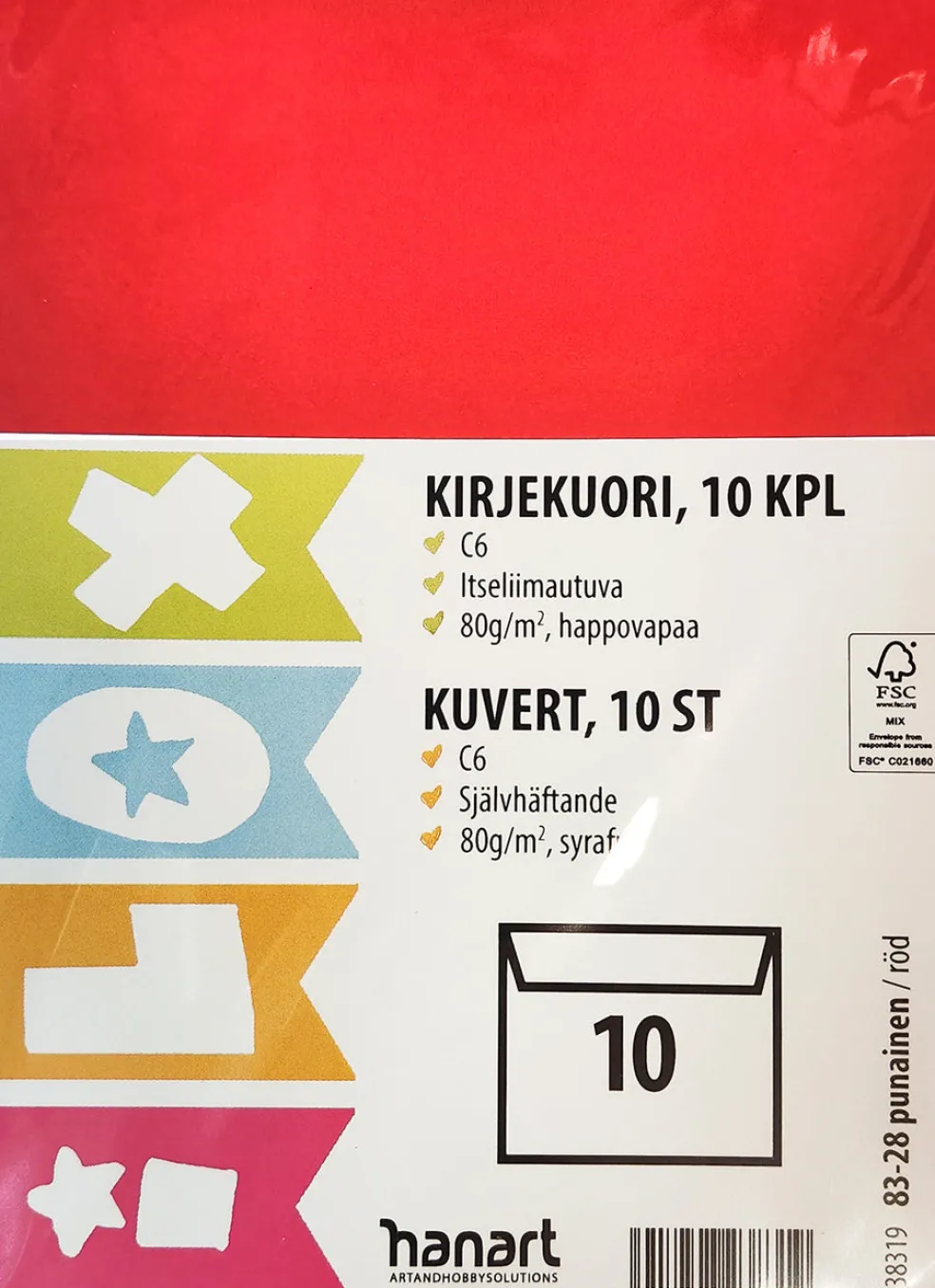 Joulunpunainen itseliimautuva kirjekuori tasaläpällä. Kaunis lähetyskuori korteille ym jouluisille postituksille. Paperin paksuus 80g.