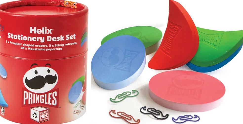 Pringles-kirjoitussetti sisältää 3 sipsin muotoista PVC-vapaata pyyhekumia, 3 x 90 kirkasväristä muistilappua ja 20 viiksien muotoista paperiliitintä – täydellinen yhdistelmä käytännöllisyyttä ja tyyliä työpöydälle.