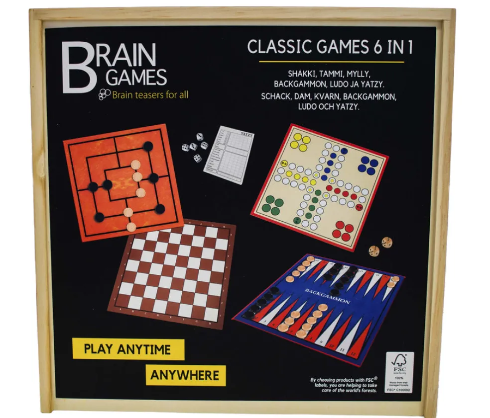 Kätevään laatikkoon pakattu pelisetti sisältää kuusi suosittua klassikkopeliä: shakki, tammi, mylly, backgammon, ludo ja yatzy. Peliohjeet suomeksi ja ruotsiksi. Ikäsuositus yli 6-vuotiaille
