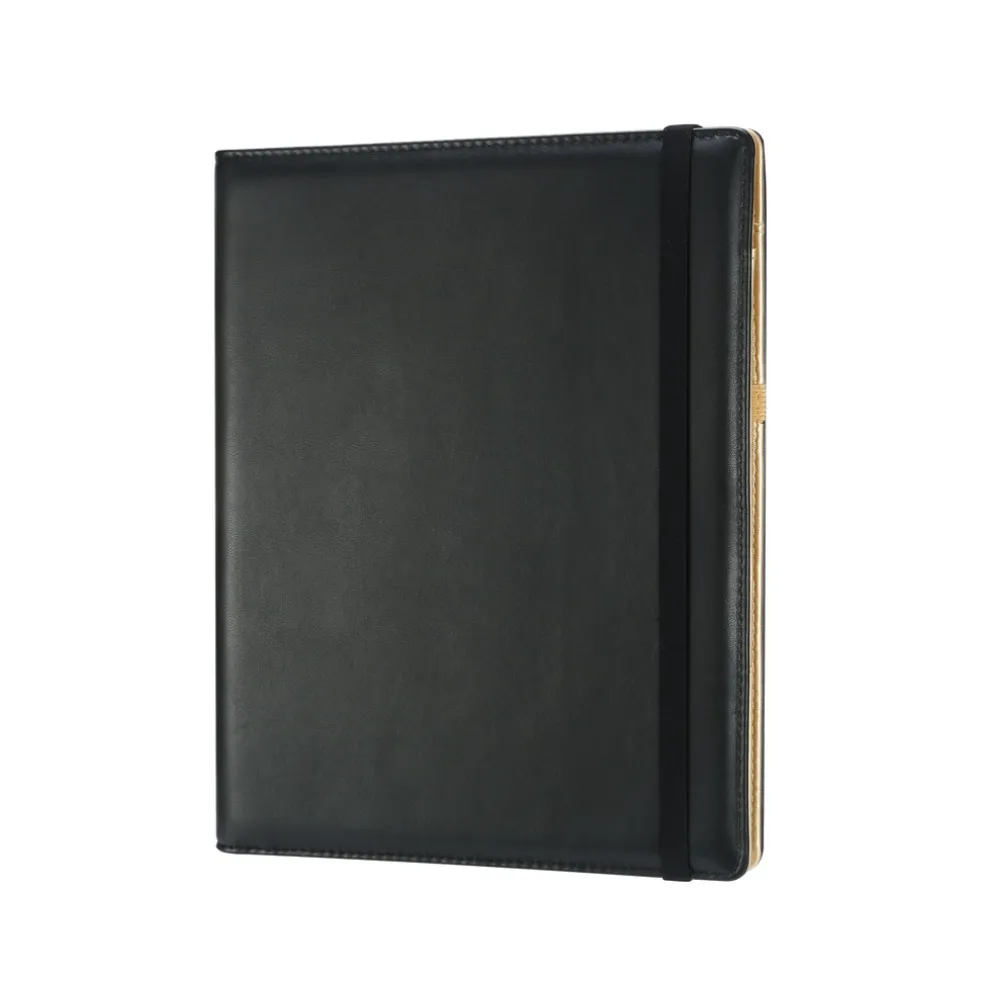 Tyylikkäästi sisäpuolelta metallinhohtoinen, sileäpintainen keinonahkakansio yhdistettynä mustekynäystävälliseen paperiin. Koko 19×25 cm. Mukana lehtiö, jossa 100 sivua (50 lehteä), pistesivut, 100gsm, norsunluupaperi.