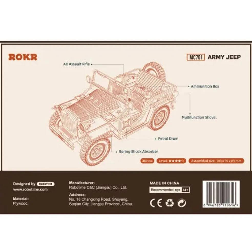 Puinen koottava Jeeppi, jonka kokoamiseen ei tarvita liimaa. 369 osaa, vaikeusaste 4 (vaikeus asteikko 1-5). Saattaa aiheuttaa tukehtumisvaaran, sisältää pieniä osia. Mukana yksityiskohtaiset ohjeet. Laserilla tarkkuusleikatut puuosat. Osat on helppo erottaa puulevyistä ja koota yhteen. Innostavaa, hauskaa puuhaa koko perheelle!