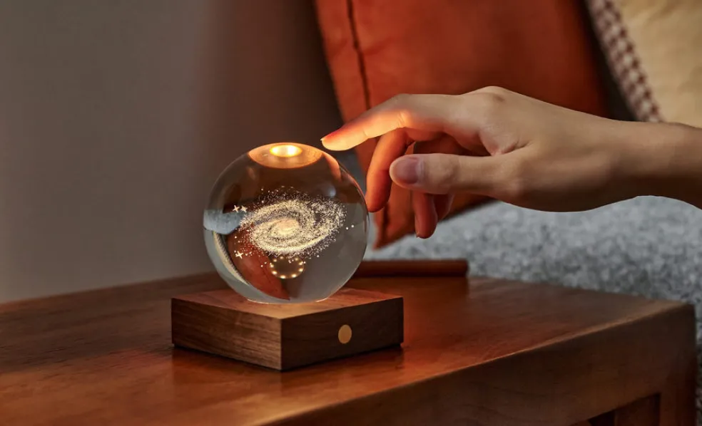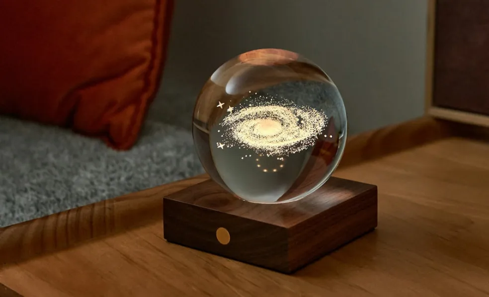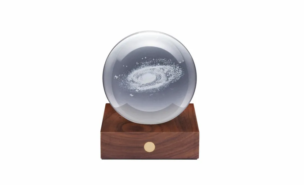 Gingko Amber Crystal Ball Light Collection on suunniteltu lisäämään ripaus taikuutta tilaan. Galaxy valaisee avaruuden tähdet ja galaksit, jotka lisäävät tilaan kosmista kauneutta ja lumoavat äärettömyydellään. 12 cm korkea kristallipallo istuu pähkinäpuisen jalustanpäällä täydentämässäsisustusta. Voit vaihtaa kolmen valotason välillä koskettamalla puisen jalustan etuosassa olevaa kuparipainiketta. Kristalli on kiillotettu kiiltäväksi, se heijastaa valoa ja luo upean vaikutelman mihin tahansa huoneeseen.