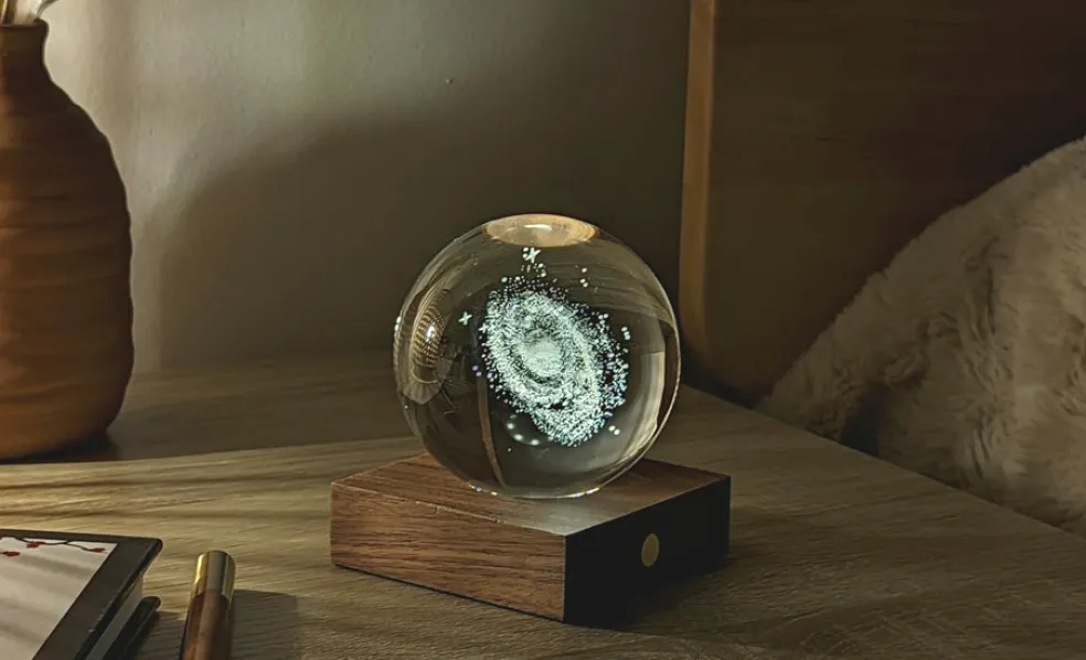 Materiaali: FSC-sertifioitu pähkinäpuujalustakorkealaatuisella kestävällä 3D-laserpainetulla lasipallolla