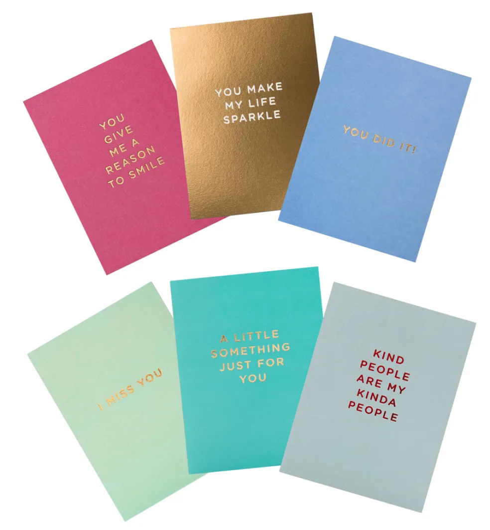 2-osainen Pikkukortti 90x120mm, 6 kpl:tta, englanninkielisiä tervehdyksiä/voimatekstejä, banderollattu nippu.