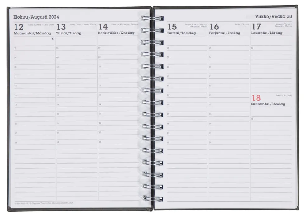 Miellyttävän tuntuiset kovat keinonahkakannet ja parikierresidonta. 18kk laajuinen viikko/aukeama sisältö, joka alkaa kesästä 2025 jatkuen aina vuoden 2026 loppuun saakka. Kaksikielinen: suomi ja ruotsi. Sisältönä mm. vuosikalenteri, lukujärjestys, koetulokset, tehtäväsivut, nimipäivät, avattava vuosisuunnitelma ja tilaa muistiinpanoille. Kalenterin paperi on FSC-sertifioitua.