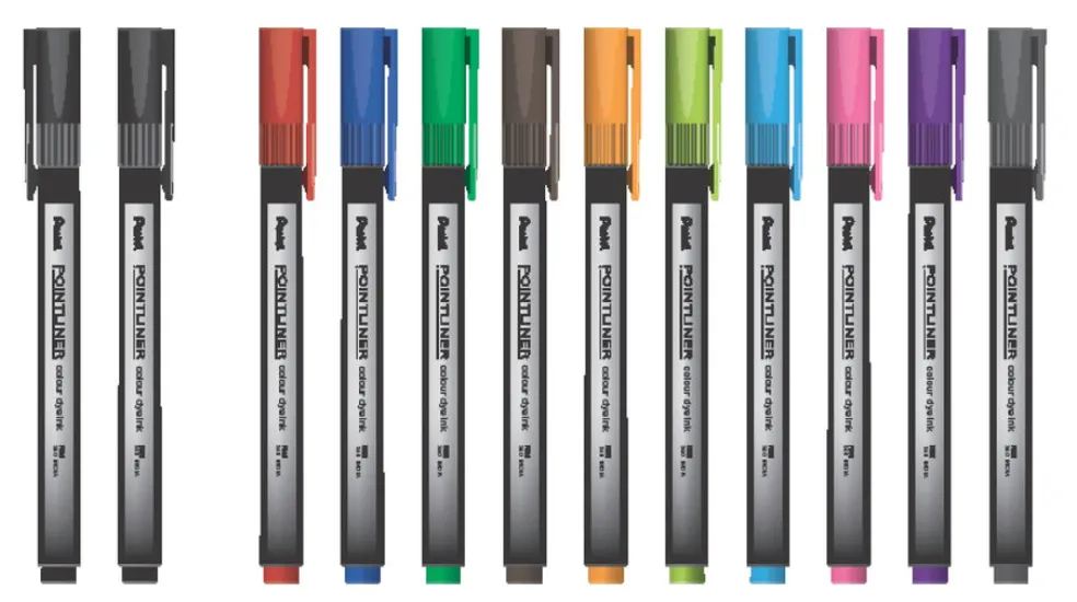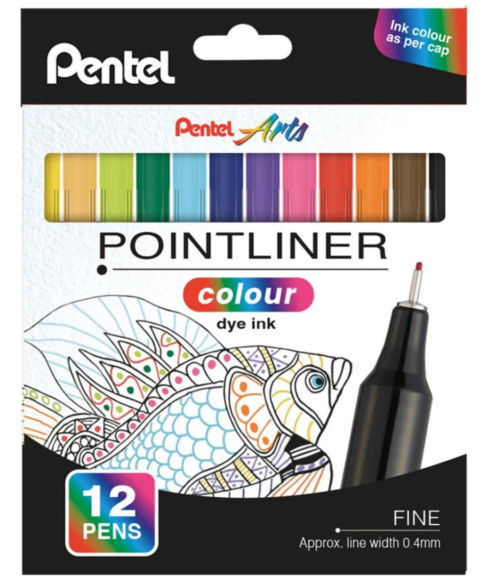 Pentelin edulliset, ohutkärkiset fineliner-kynät, joilla kirjoitat, piirrät ja teet värikkäät merkinnät. Kynissä on runsaasti mustetta ja 0,4 mm ohuet, kestävät metallikehystetyt kuitukärjet. Muste on vesipohjaista. Monipakkauksessa 12 kynää eri väreissä.