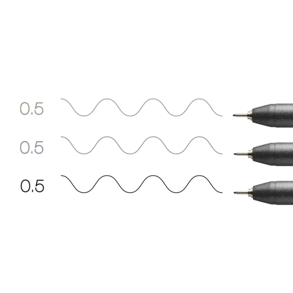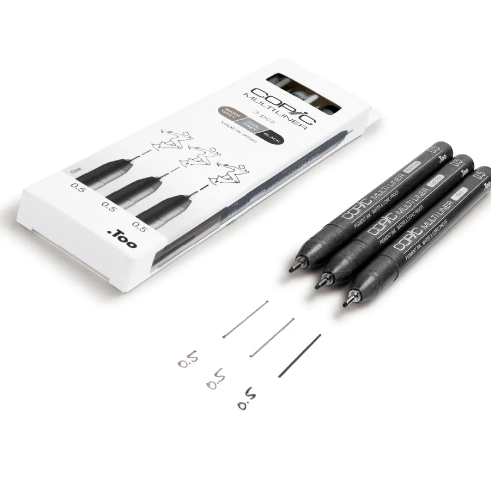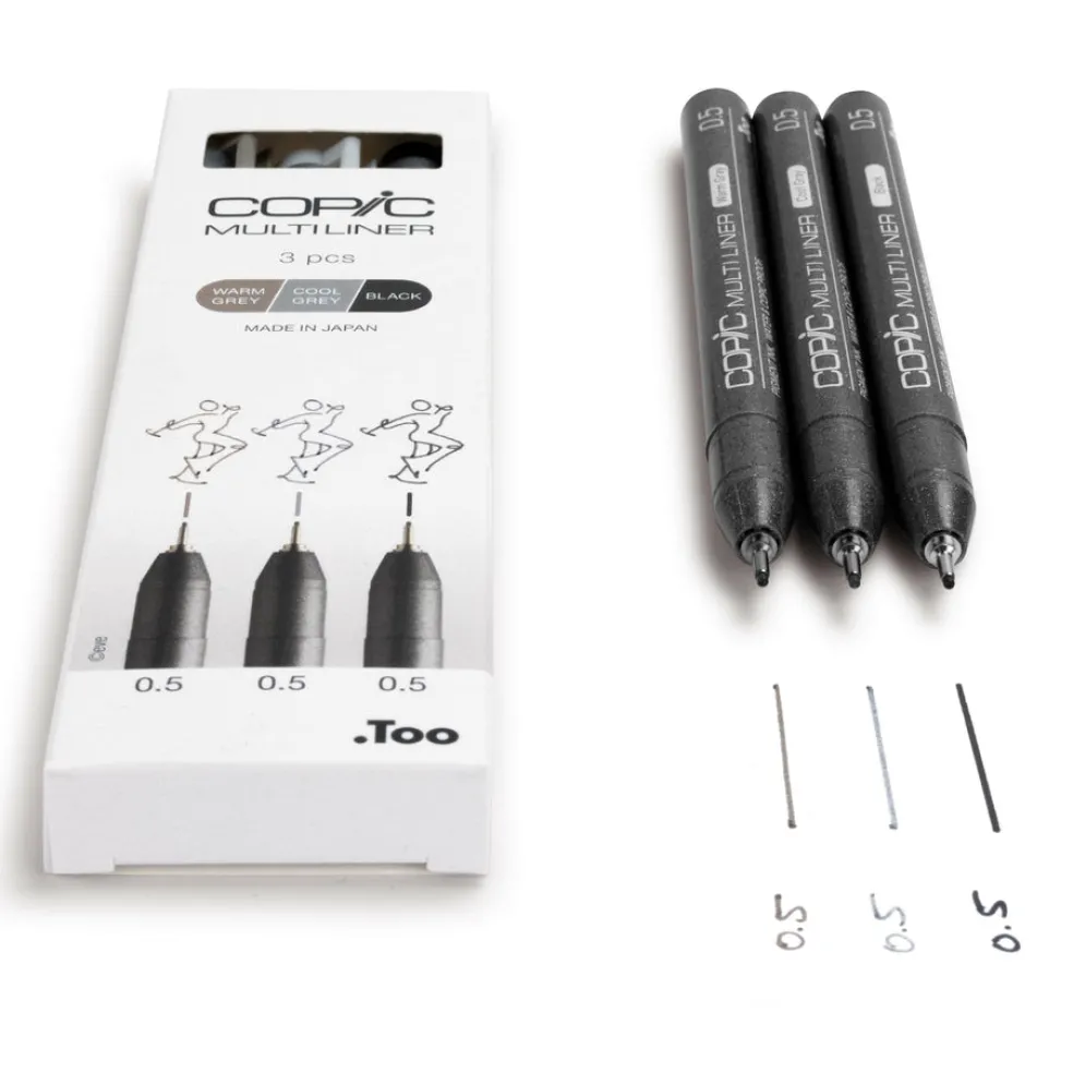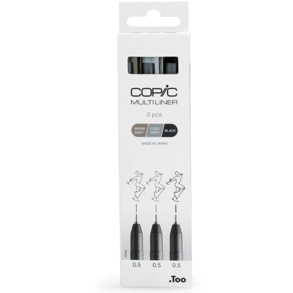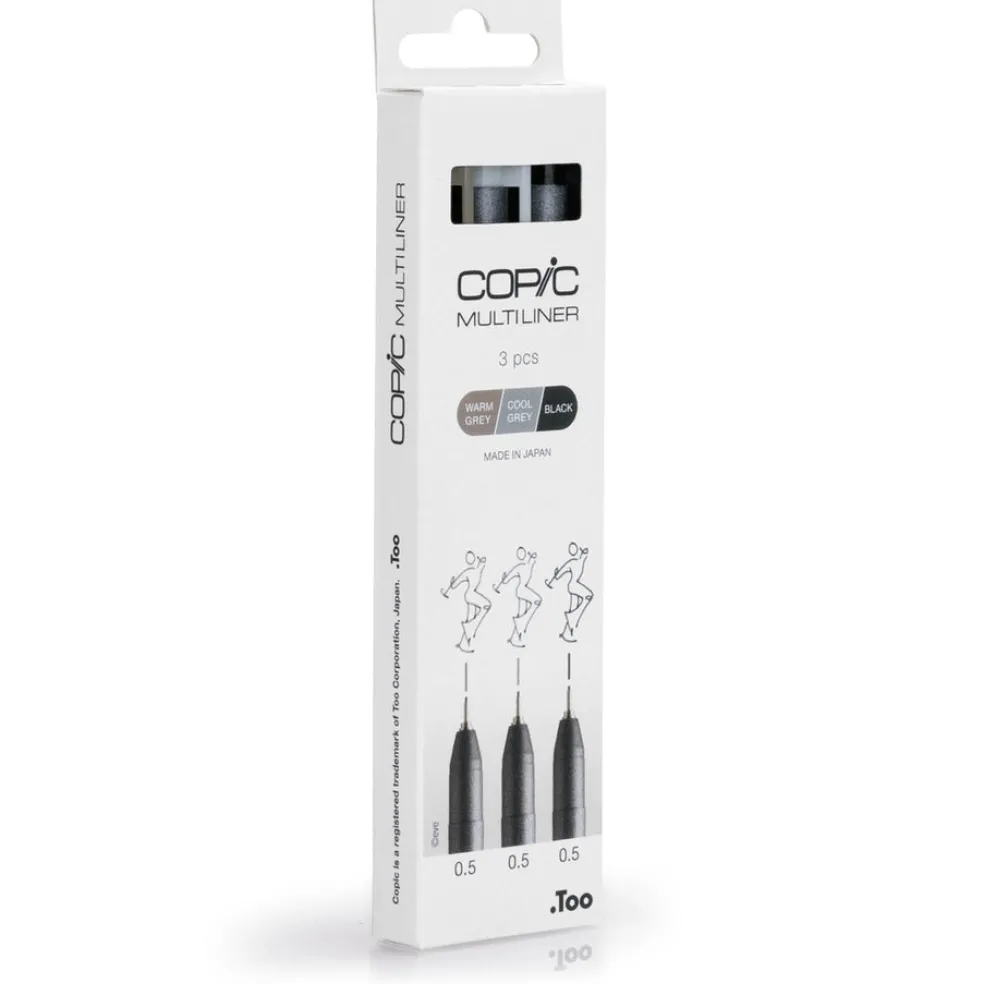 Copic Multiliner on luonnostelu- ja piirustuskynä, jolla saa uskomattoman tarkkaa jälkeä. Lajitelmassa on kolme 0,5 kynää. Pigmenttipohjainen muste on veden- ja alkoholinkestävä ja ihanteellinen käytettäväksi myös Copic-tussien kanssa. Muste ei leviä eikä haalistu ja juoksee tasaisesti – ihanteellisen kynäsarja kaikentyyppisiin luonnoksiin ja kuvituksiin sekä merkintöihin.