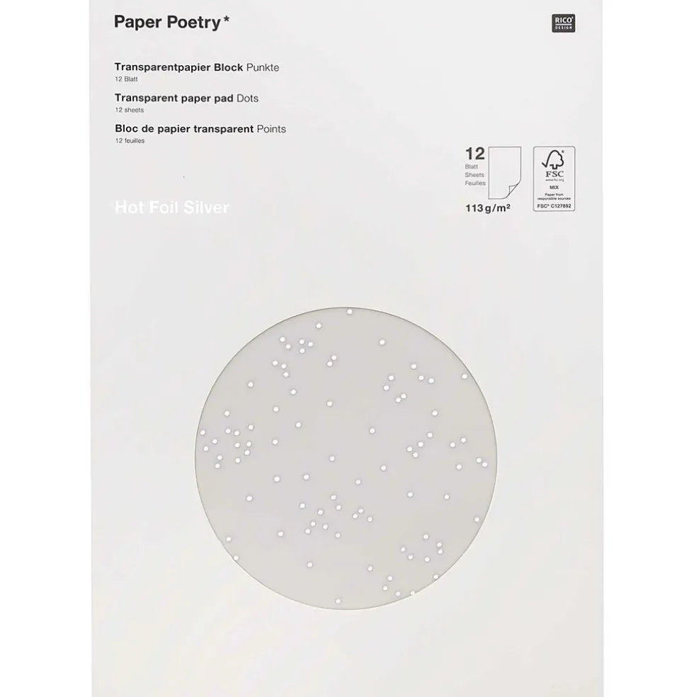 Kuultopaperilehtiö, jossa on folioidut pilkut, tuo ripauksen ylellisyyttä askarteluprojekteihisi. Lehtiössä on 12 arkkia, joiden koko on 21 x 29,5 cm ja paino 113 g/m². Tämä ei ole tavallinen paperilehtiö, sillä sen pinnalla on lukuisia pieniä pilkkuja, jotka on luotu kuumafoliointiprosessilla.