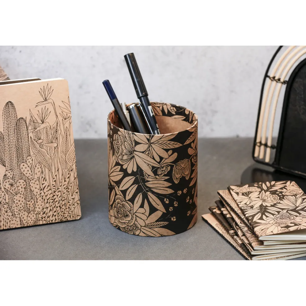 Kynät järjestykseen kauniiseen kartonkiseen kynäpurkkiin, jonka mitat ovat Ø9×11 cm