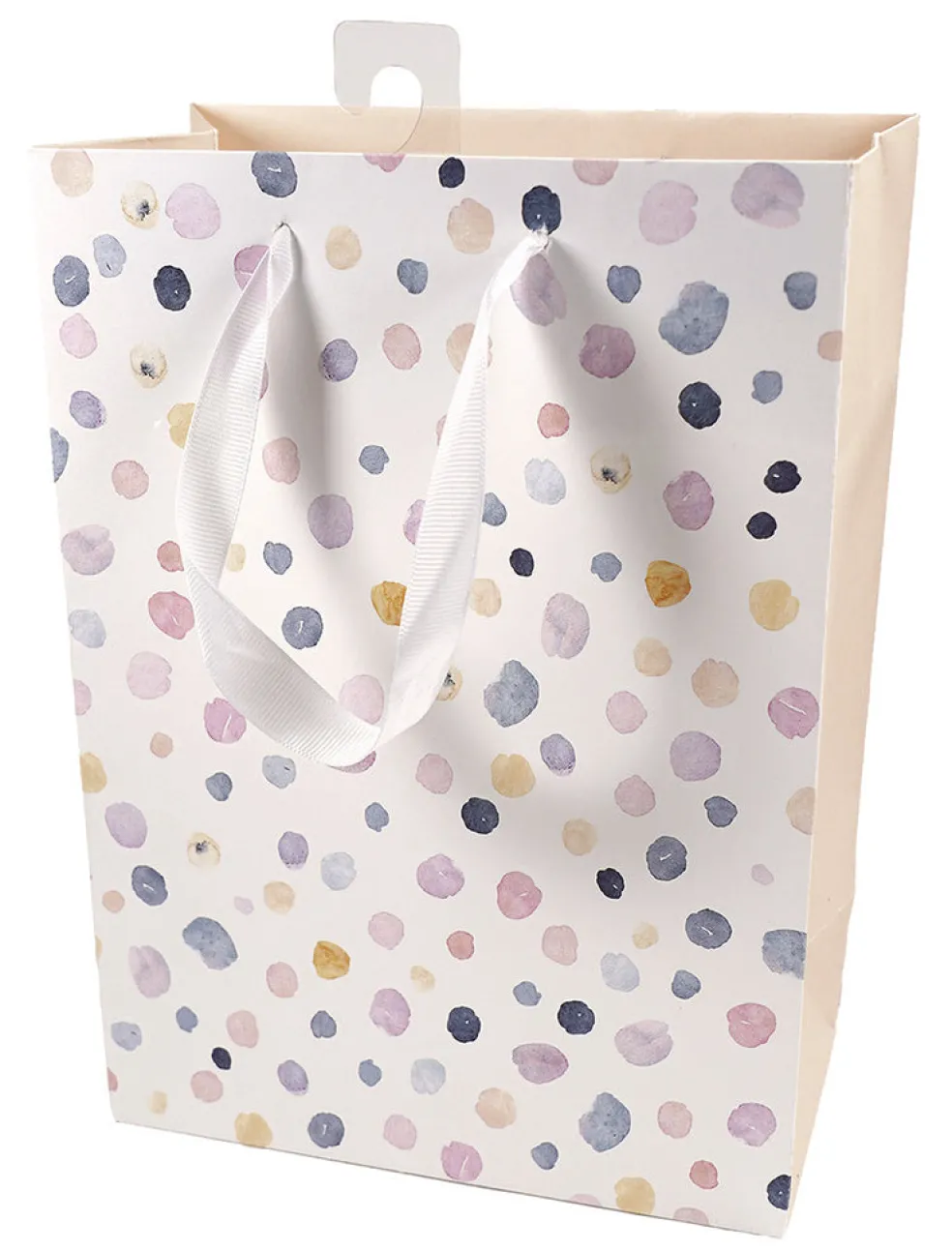 Korkealaatuinen Linnis Design lahjakassi pastellisävyisin pilkuin koristeltu ja ribatuilla nauhakahvoilla. L-koko, 23 x 13 x 30 cm.