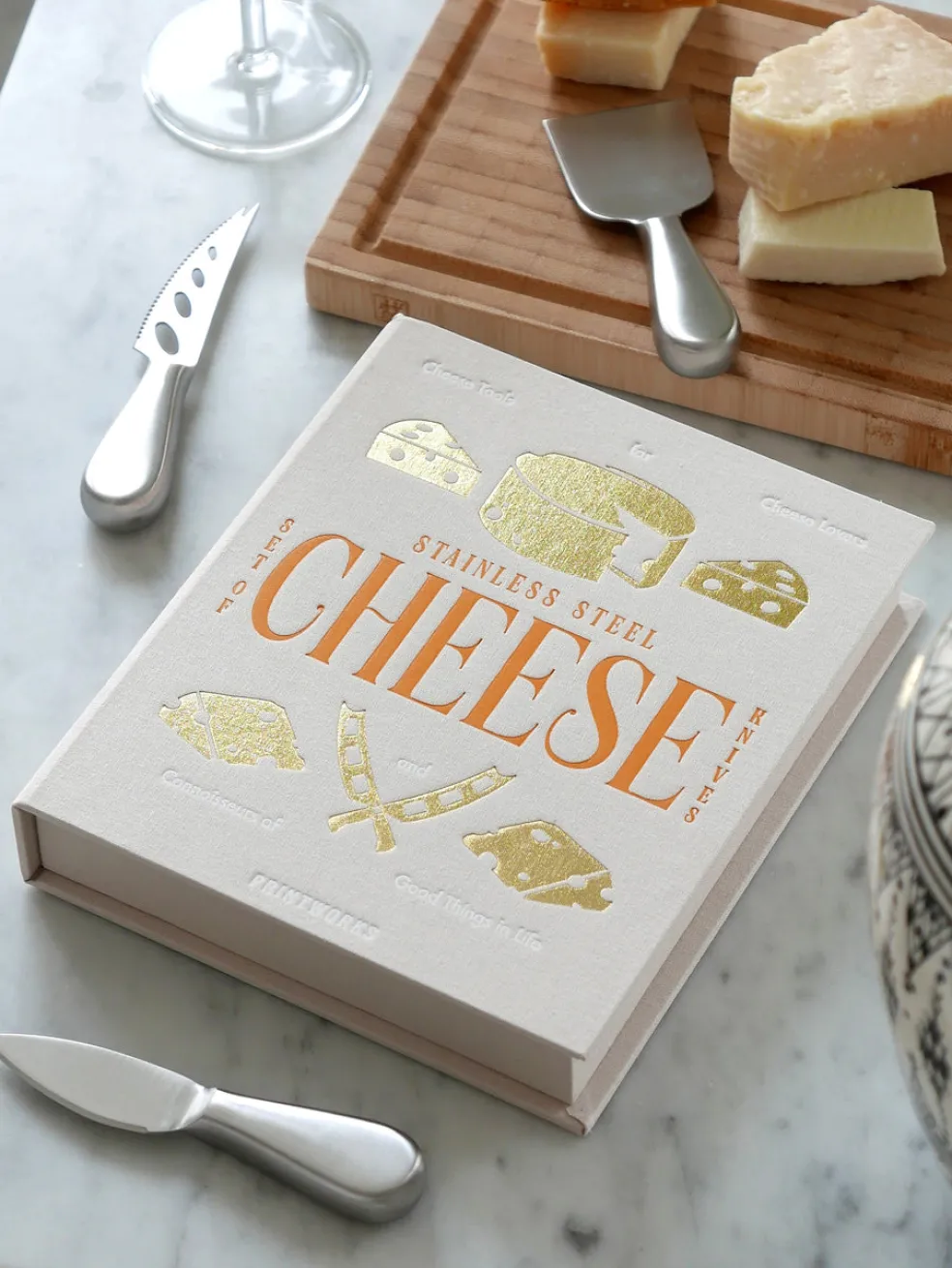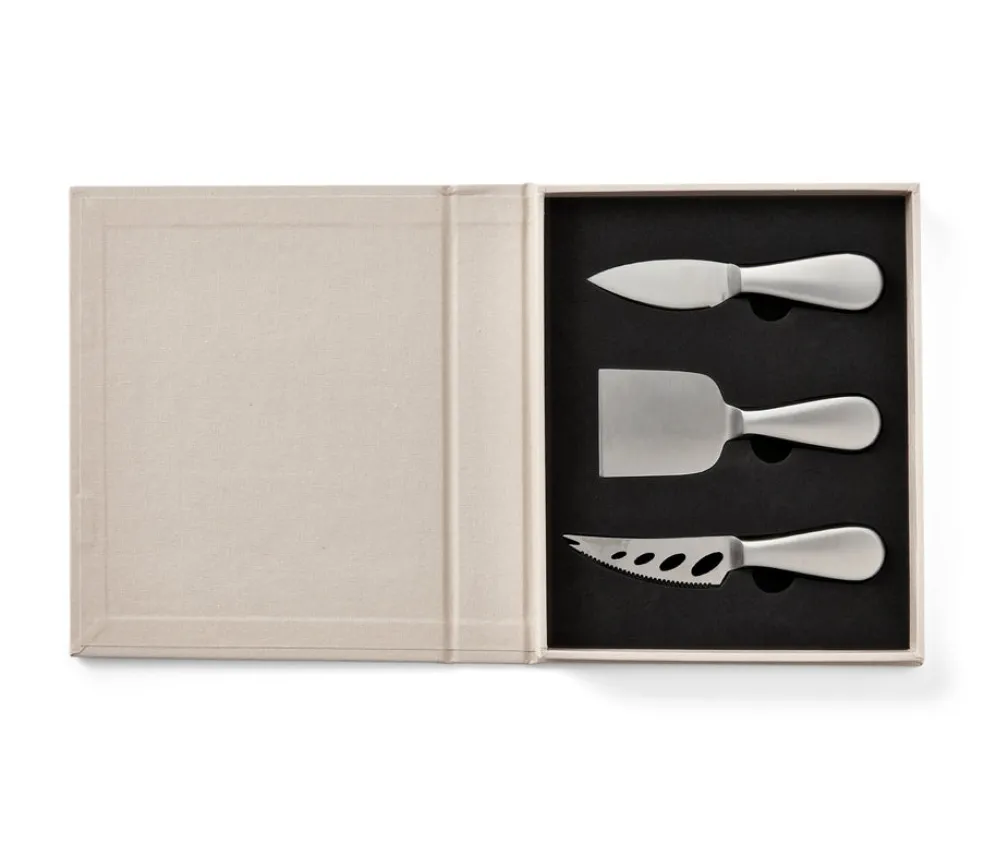 Välttämättön välinepakkaus juustolautasellesi – hienostuneen työkalusetti elegantissa kirjamaisessa laatikossa, joka on täydellinen lahja tai oman kodin sisustukseen tuomaan pientä lisää. Sisältä löydät kolme veistä, jotka sopivat suosikki juustolajikkeisiisi – pehmeästä Briestä murenevaan sinihomejuustoon ja vahvaan parmesaaniin. Kaikki tuotteet ovat ruostumatonta terästä ja kestävät astianpesukoneen.