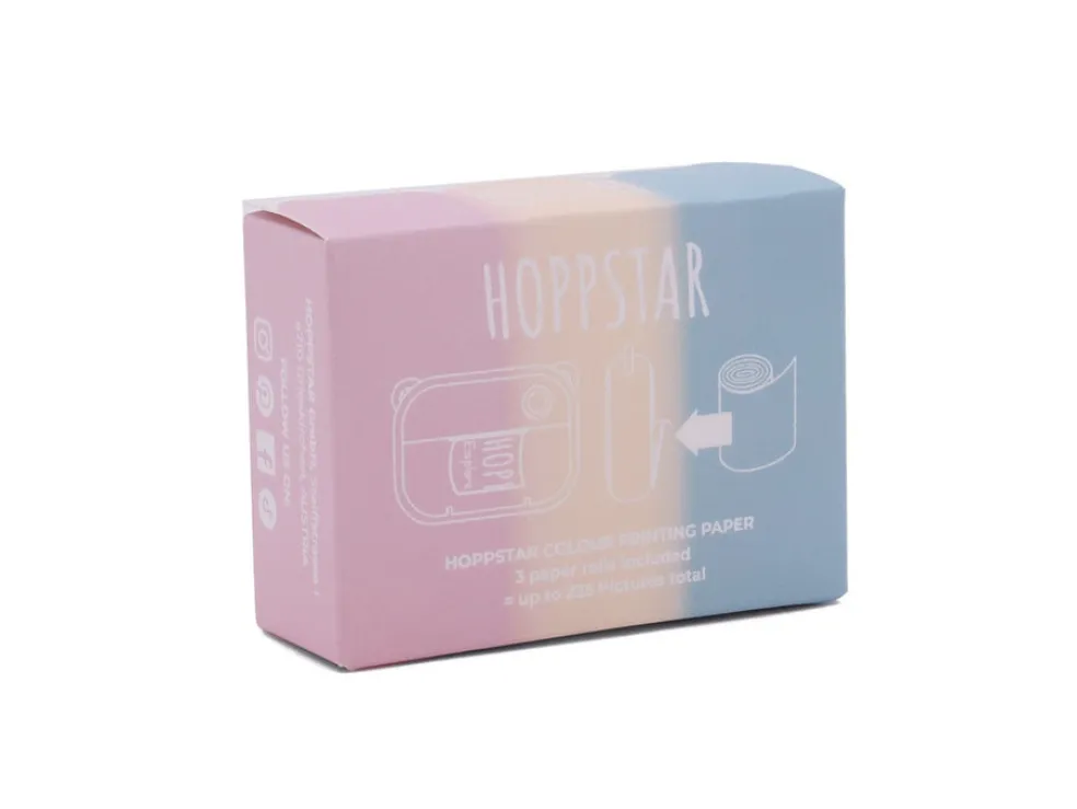 HOPPSTAR Artist-kameraan kolmen rullan täyttöpakkaus värikästä lämpöpaperia. Pakkauksessa 1kpl vaaleanpunainen, 1kpl vaaleansininen ja 1kpl vaaleankeltainen rulla. Rullista saat tulostettua yhteensä noin 225 kuvaa!