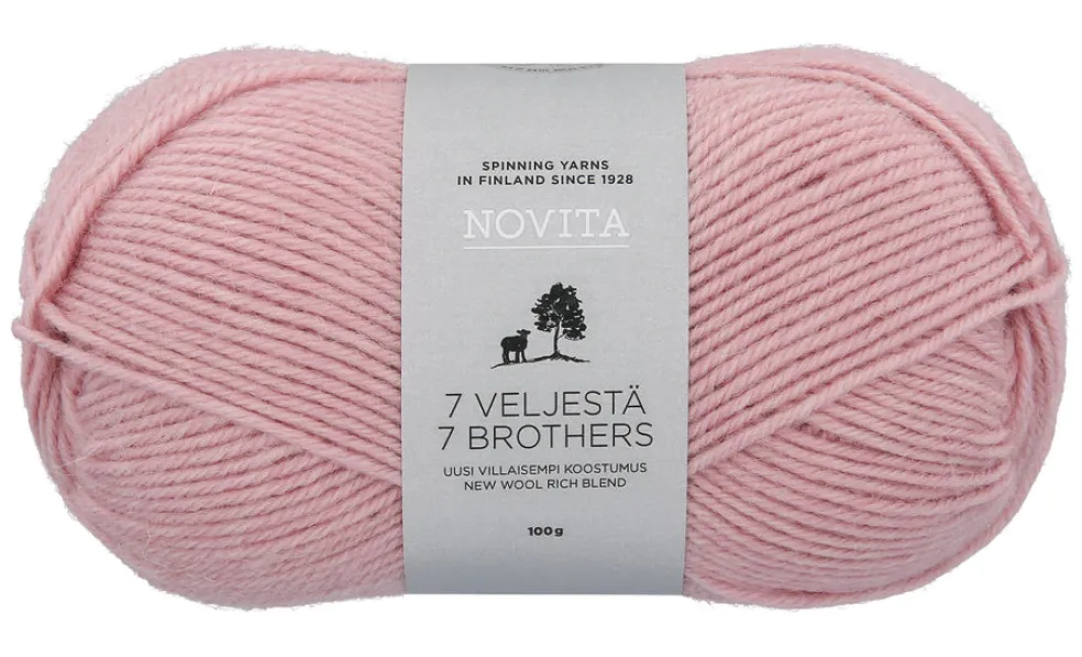 Novita 7 Veljestä on jo vuosikymmenien ajan ollut hyvästä syystä Suomen tunnetuin ja suosituin lanka. Suosion takana on ollut langan ihanteellinen koostumus ja oikeanlainen kierre, joiden ansiosta lanka sopii monipuolisesti erilaisiin neuletöihin. Nyt langan koostumukseen on lisätty villan määrää, jolloin se on kuohkeampi ja entistä miellyttävämpi neuloa. 7 Veljestä sisältää 80 % lämmittävää villaa ja 20 % polyamidia, joka antaa langalle kestävyyttä. Monikäyttöinen lanka sopii mainiosti kaikenlaisiin neuleisiin ja asusteisiin ja erityisesti villasukkiin. 7 Veljestä -langalle sopivat kaikki kansainväliset neuleohjeet, joihin suositellaan Aran-vahvuisia lankoja. M-kokoiseen neuleeseen tarvitaan noin 600 grammaa lankaa ja yksi kerä riittää perussukkiin koossa 38. Tuotteet voidaan konepestä 40 asteessa. Puikkosuositus 4, sukkiin puikot 3.5. Aran-vahvuisten lankojen puikkosuositus 5. 100 gramman kerässä on 200 metriä lankaa. Novita 7 Veljestä -lanka on Avainlipputuote.