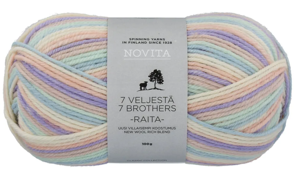 Novita 7 Veljestä Raita on monivärinen ja nerokas sukkalanka, josta sukkia neulottaessa saa tasaraitasukan ilman kerän vaihtoja. Langassa on sama koostumus kuin yksivärisessä Novita 7 Veljestä -langassa; 80 % lämmittävää villaa ja 20 % polyamidia, joka antaa langalle kestävyyttä. 7 Veljestä Raita sopii monipuolisesti erilaisiin neuletöihin ja erityisesti villasukkiin. M-kokoiseen neuleeseen tarvitaan noin 600 grammaa lankaa ja yksi kerä riittää perussukkiin koossa 38. Tuotteet voidaan konepestä 40 asteessa. Puikkosuositus on 4, sukkiin puikot 3.5. 100 gramman kerässä on 200 metriä lankaa. Novita 7 Veljestä Raita -lanka on Avainlipputuote.