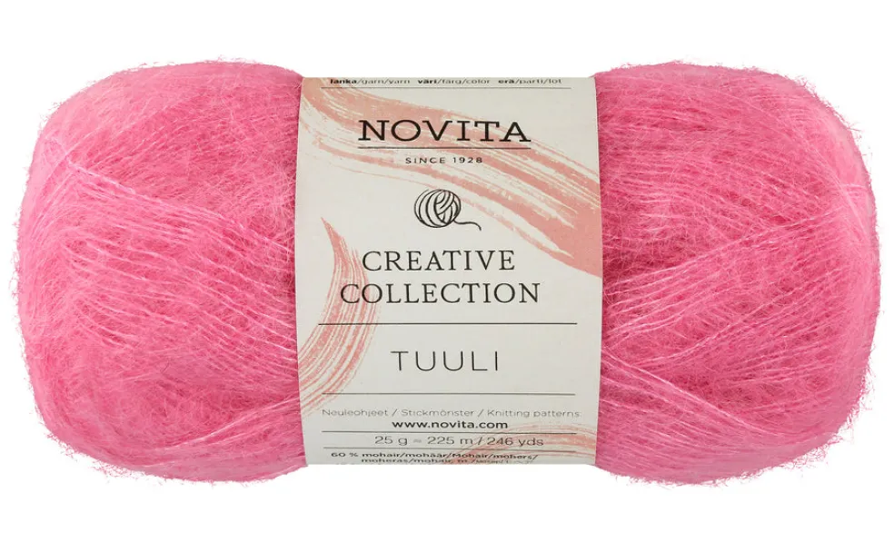 Ihanan pörröisenpehmoinen Novita Tuuli -mohairsekoitelanka sopii käytettäväksi joko sellaisenaan tai yhdistettynä toiseen lankaan. Lanka sisältää 60 % mohairia ja 40 % viskoosia, joka antaa langalle hienostuneen himmeän kiillon. Ylellisen tuntuisesta langasta syntyvät niin asusteet kuin neulevaatteetkin. Langan valmistukselle on myönnetty Oeko-tex® STANDARD 100 -tuoteturvallisuusmerkki. Puikkosuositus langalle on 3.5. Riittoisassa 25 gramman kerässä on 225 metriä lankaa. Novita Tuuli -langasta tehdyille tuotteille on suosituksena varovainen käsipesu.