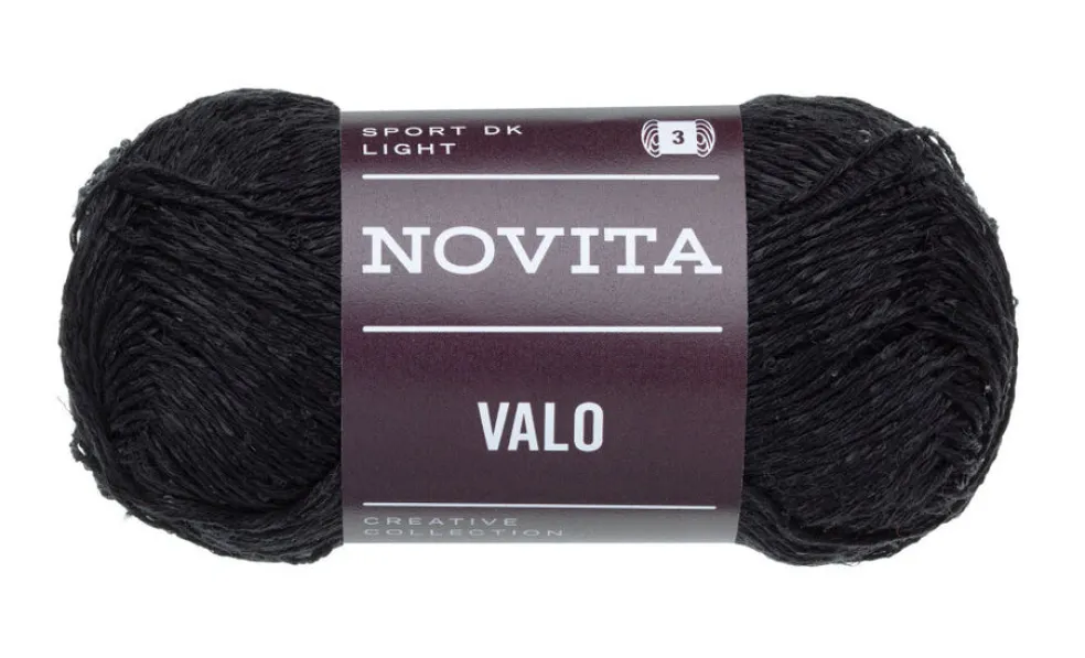 Novita Valo on neulelanka kaikille, jotka kaipaavat elämään pientä kimalletta. Ohuessa polyesterin ja puuvillan sekoitteessa on mukana pieniä helkkyviä paljetteja, jotka tuovat neulepintaan juhlavaa elävyyttä. Valo-lanka sopii erinomaisesti tyylikkään juhlaviin neulevaatteisiin ja asusteisiin ja ohutta lankaa voi helposti myös yhdistellä muihin Novitan lankoihin. Sport DK-vahvuisessa langassa on 50 gramman kerässä 170 metriä lankaa. Puikkosuositus langalla on 4 mm. Novita Valo -langasta valmistetut tuotteet tulee pestä käsin.
