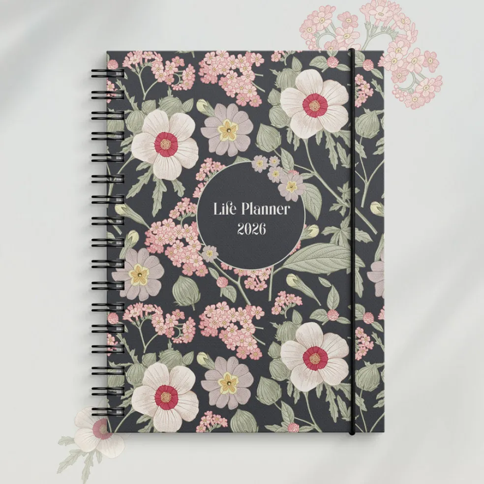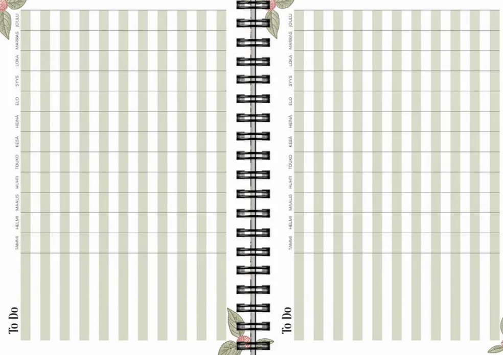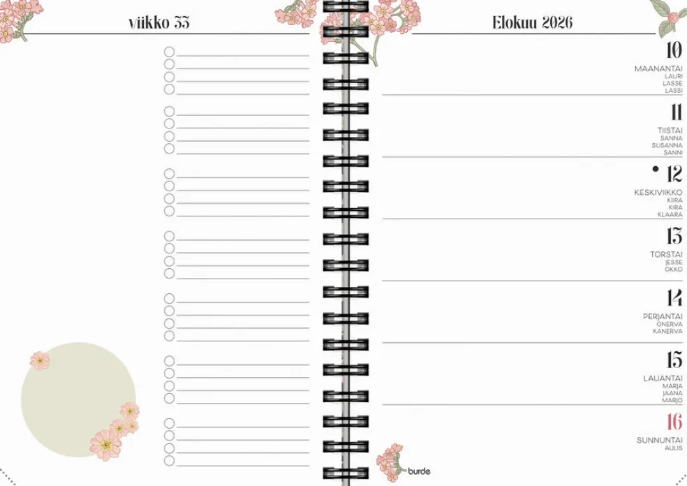 Täydellinen elämänsuunnittelijasi pienessä ja näppärässä muodossa, jonka voit helposti kuljettaa mukanasi arjessasi! Se sisältää kaiken mitä elämänsuunnittelija tarvitsee päivittäisille tehtävälistoille, tilaa heijasteluille tai pienille arkitaiteillesi. Kuukausi- ja vuosisuunnitelmat tekevät päivän, viikon, kuukauden tai tulevan vuoden suunnittelusta yhtä helpoksi. Painettu kartonkikansi kuminauhalla. Kalenteri sisältää nimipäivät, juhlapyhät, liputuspäivät, kuun vaiheet, vuosiruudukot kuluvalle ja seuraavalle vuodelle ja muistiinpanosivuja. Kalenteriosa: vk 52 2025 – vk 53 2026/2027. Suomenkielinen. Parikierresidottu. FSC®. Koko: 105×148 mm (A6).