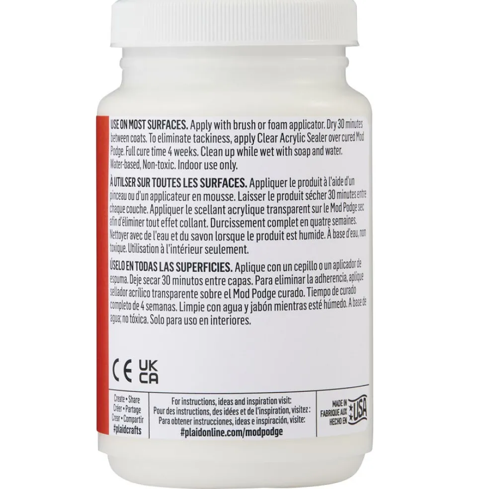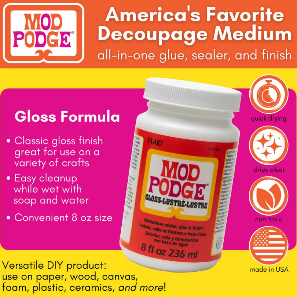 Vesiliukoinen, kiiltäväpintainen liimalakka decoupage-työskentelyyn eli ns. serviettitekniikkaan ja monipuoliseen yleisaskarteluun koville pinnoille. Mod Podge soveltuu erinomaisesti esimerkiksi kodinsisustusprojekteihin, vanhojen esineiden kunnostamiseen, paperi- ja korttiaskarteluun, lahjojen personalisointiin sekä mixed media -työskentelyyn. Työvälineiksi sopivat erilaiset siveltimet, lastat sekä tuputtimet käyttökohteesta riippuen. Työvälineet voi pestä vedellä ja saippualla.