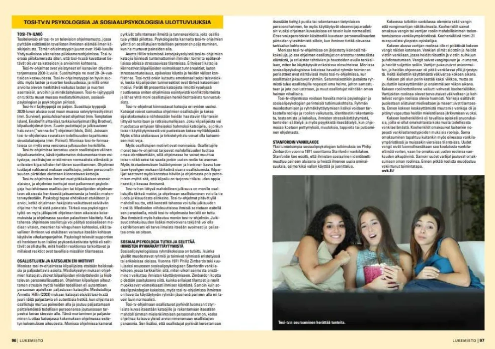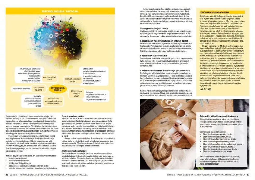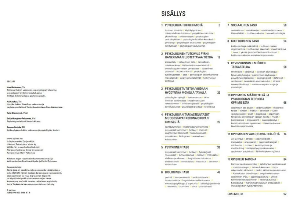Kirjan luvuissa on esitetty keskeinen aines päätekstissä ja syventävä aines värillisellä pohjalla olevissa lisäteksteissä. Kirjan lopussa on lisäksi laaja lukemisto. Lukemisto laajentaa psykologian ensimmäisen kurssin sisältöjä olennaisella ja oivaltavalla tavalla. Ainutlaatuisen laajalla lukemistolla on kaksi tavoitetta. Se tarjoaa kiinnostavia lukuhetkiä niille, jotka opiskelevat vain psykologian pakollisen kurssin. Lisäksi lukemisto tarjoaa psykologian ylioppilaskirjoituksissa kirjoittaville mahdollisuuden tavoitella korkeinta arvosanaa.