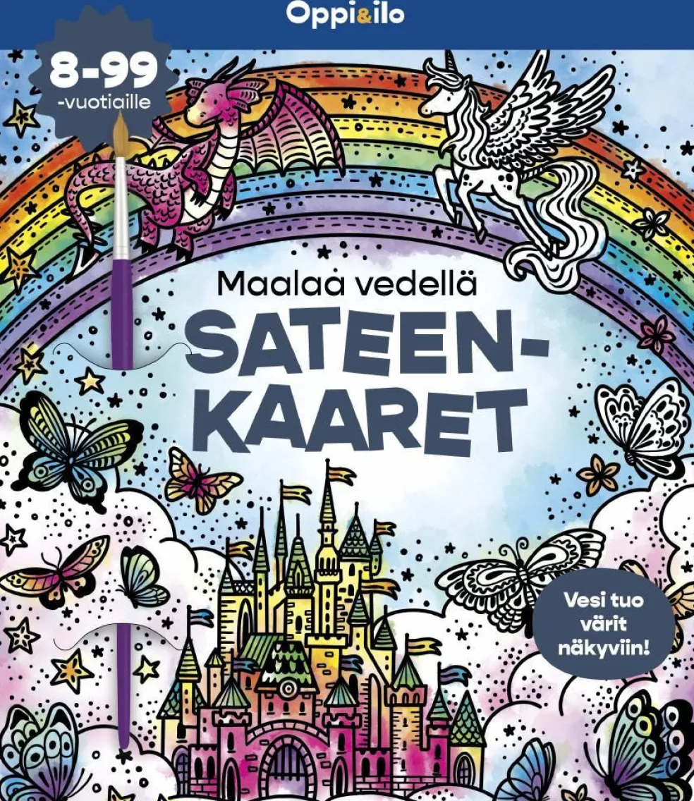 Herätä sateenkaaret ja satumaailman yksisarviset, lohikäärmeet, keijut ja muut upeat taruolennot eloon. Kasta sivellin veteen, väritä mustavalkoiset kuviot huolella, ylläty ja ihastu!