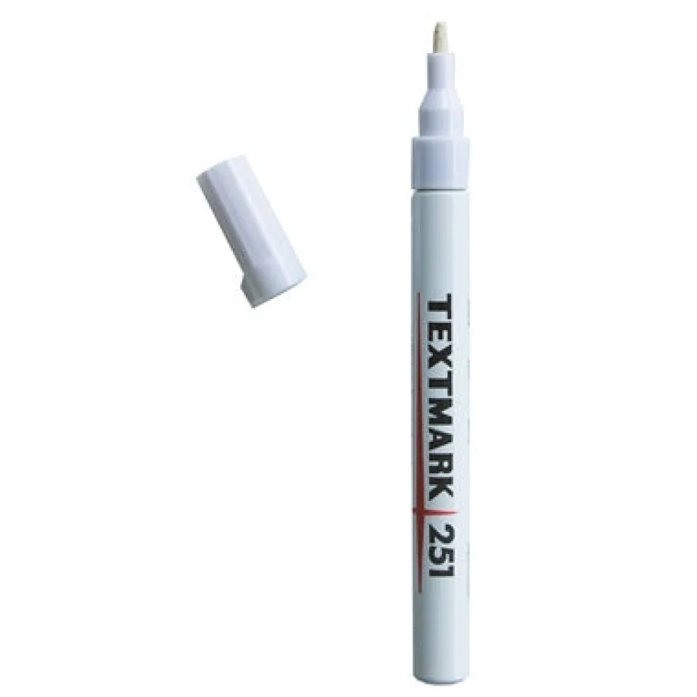 Peittävä maalikynä. Veden- ja valonkestävä. Viivan leveys 1 mm. Väri valkoinen. Suomalaiset ovat kirjoittaneet Textmark-merkkaus- ja maalikynillä jo yli 50 vuoden ajan.