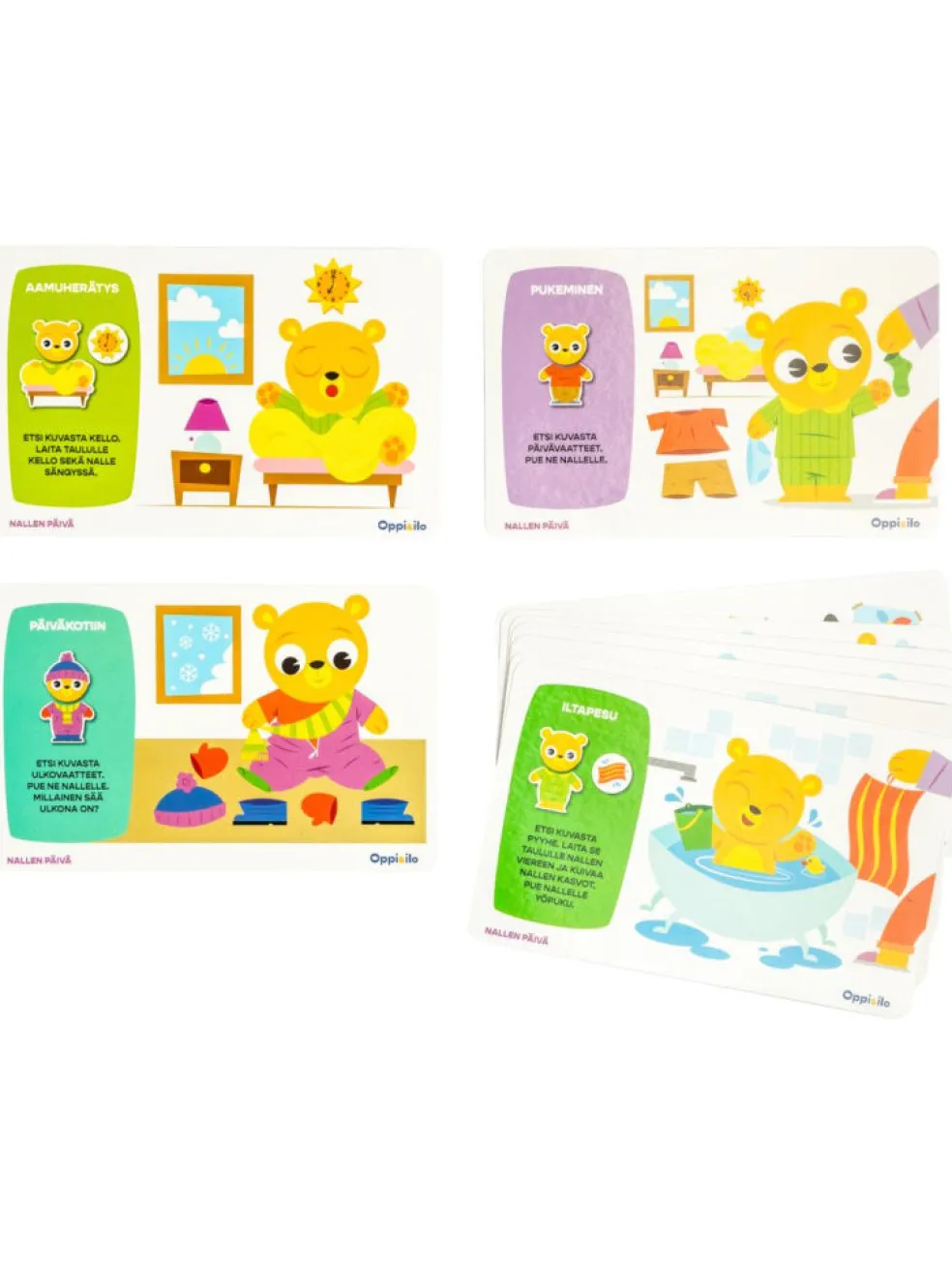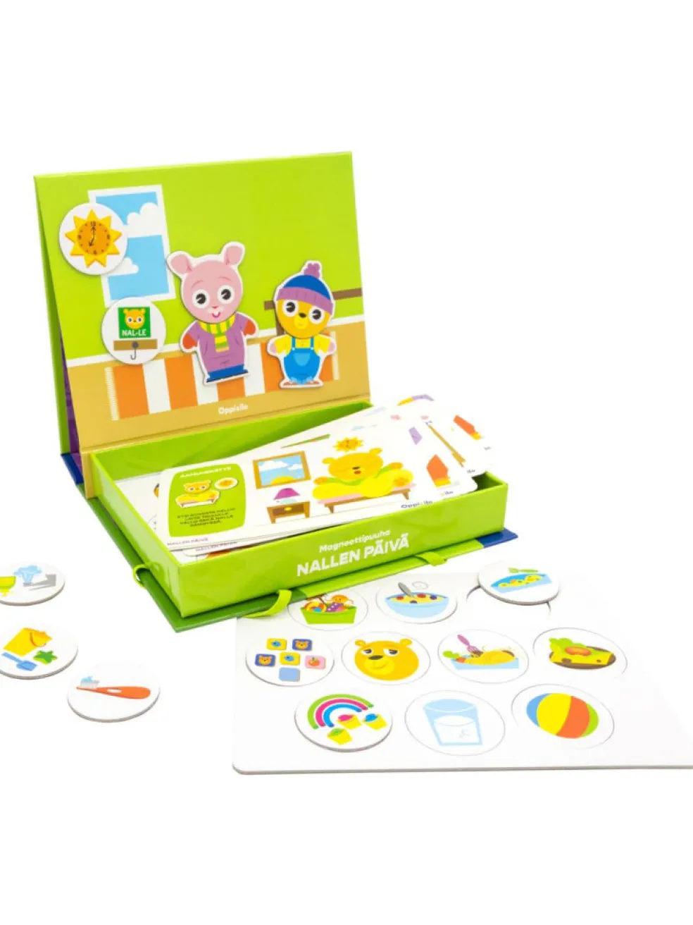 Herätys – nyt alkaa nallen päivä! Laita nalle potalle, pese sen tassut ja harjaa hampaat. Mitä nalle pukee päälleen tai syö aamupalaksi? Iloinen magneettipuuha innostaa lasta leikkimään ja harjoittelemaan päivän rytmiä ja rutiineja yhdessä nallen kanssa. Kuvien kokoaminen taululle kehittää lapsen hienomotoriikkaa ja keskittymistä, yksityiskohtien tutkiminen kuvanlukutaitoa ja nimeäminen sanavarastoa. Kestävillä magneeteilla voi kehittää lukemattoman määrän omia leikkejä, joten iloa riittää pitkäksi aikaa.
