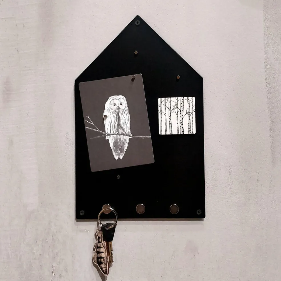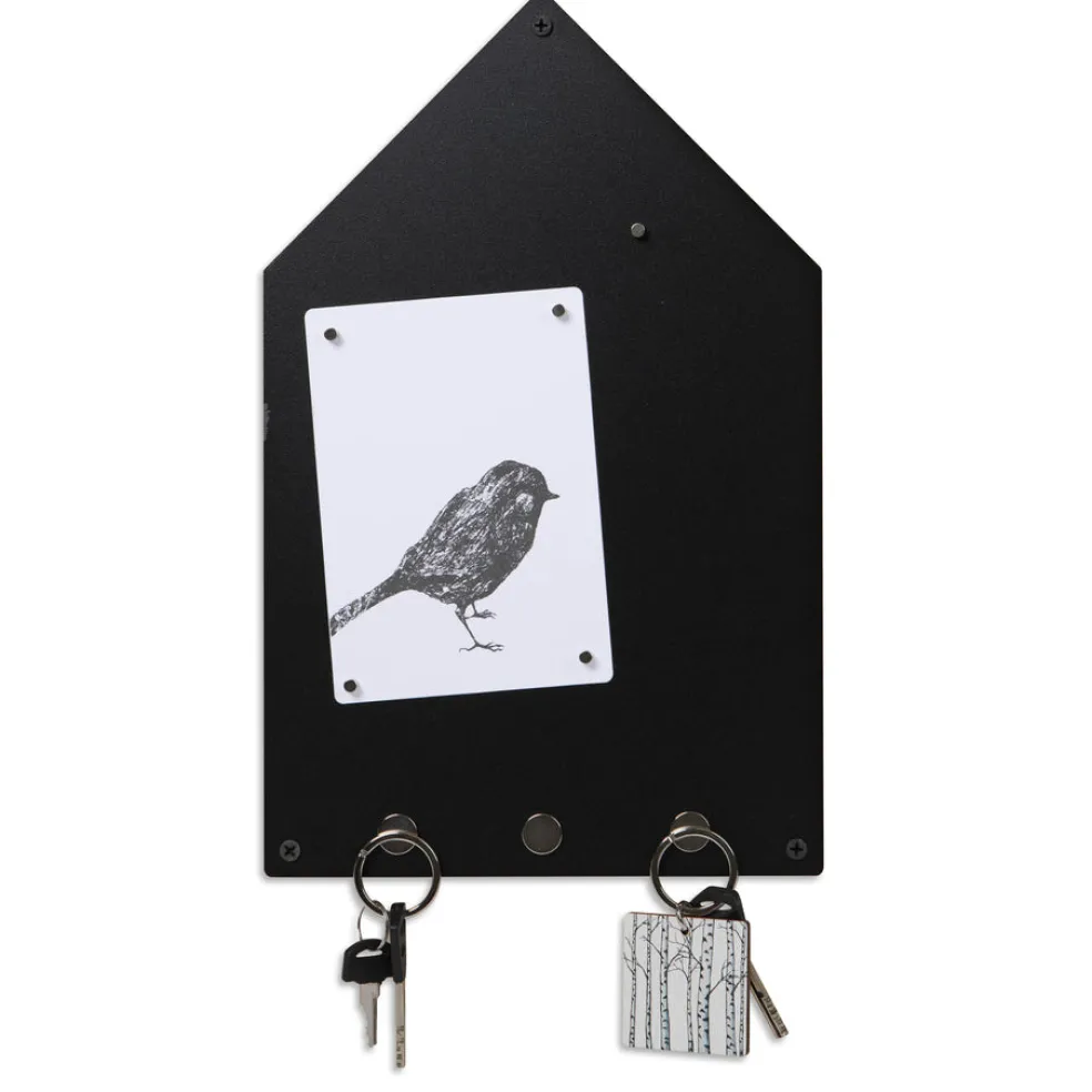Talo magneettitaulu on mustaksi maalattu terästä. Koko: 21x33cm sisältää 3 magneettia avaimille, 5 magneettia muistilapuille sekä kiinnikkeet ripustamista varten. Avainlippu ja Design from Finland merkki