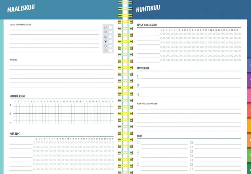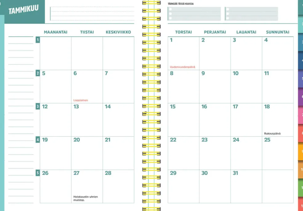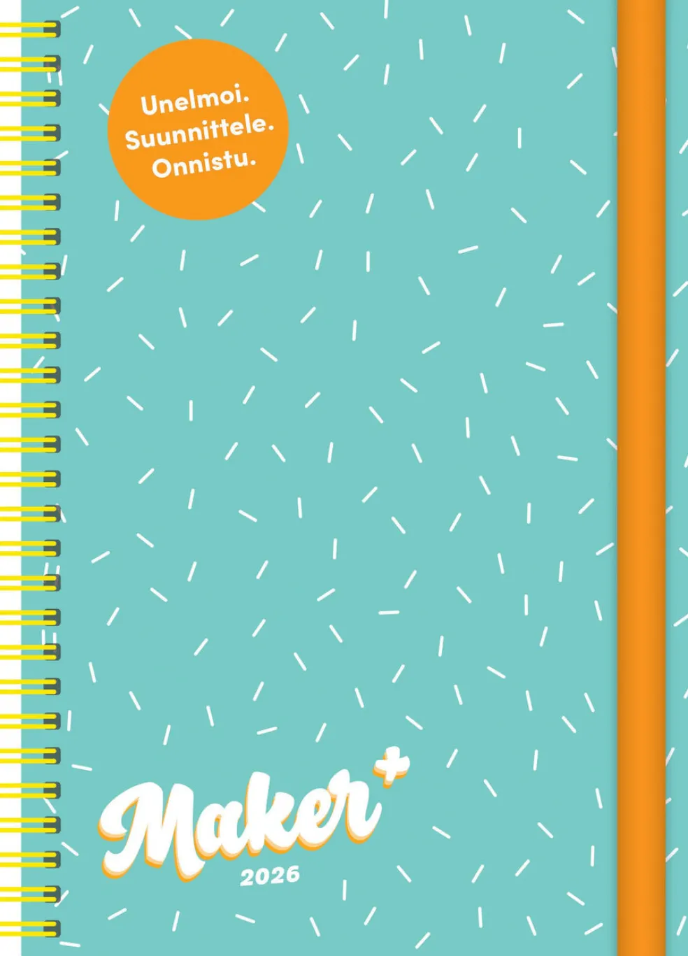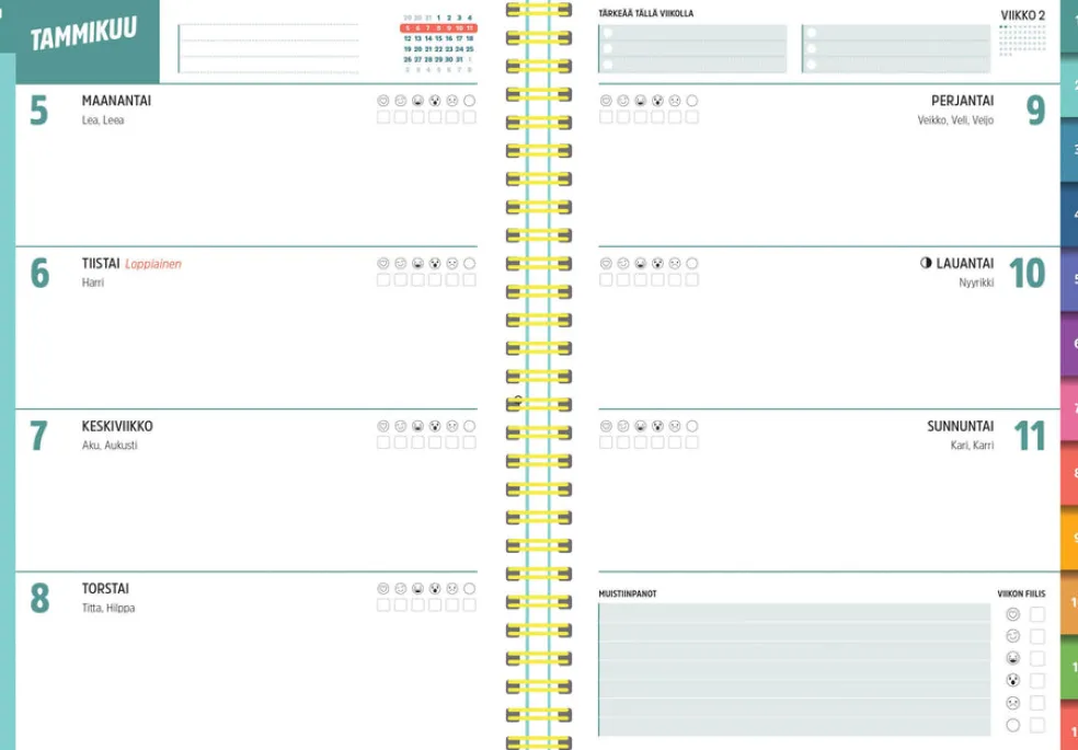Koko 148 x 210 mm (A5); parikierresidottu; tukevat kuminauhalla suljettavat kartonkikannet; päiväkirja 1/2026-53/2026; vuosisuunnitelmat 2026 ja 2027; joka kuukauden alussa hyvinvointi- ja kuukausisuunnitelma-aukeama; liputuspäivät Suomessa; suomenkieliset nimipäivät; muistiinpanosivuja; 3 tarra-arkkia; paperitaskut etu- ja takakansissa; FSC®-sertifioitu tuote.