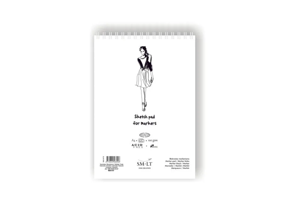 Valkoinen, toiselta puolelta päällystetty 100g FSC-sertifioitu paperi joka ei päästä tussin jälkeä seuraavalle sivulle. Paperin pinta on sileä ja soveltuu erityisesti huopa- ja geelikynille. Kartonkikannet ja kierre yläreunassa. 50 lehteä