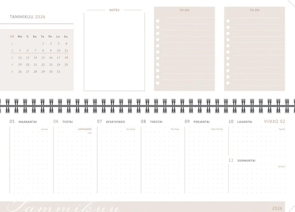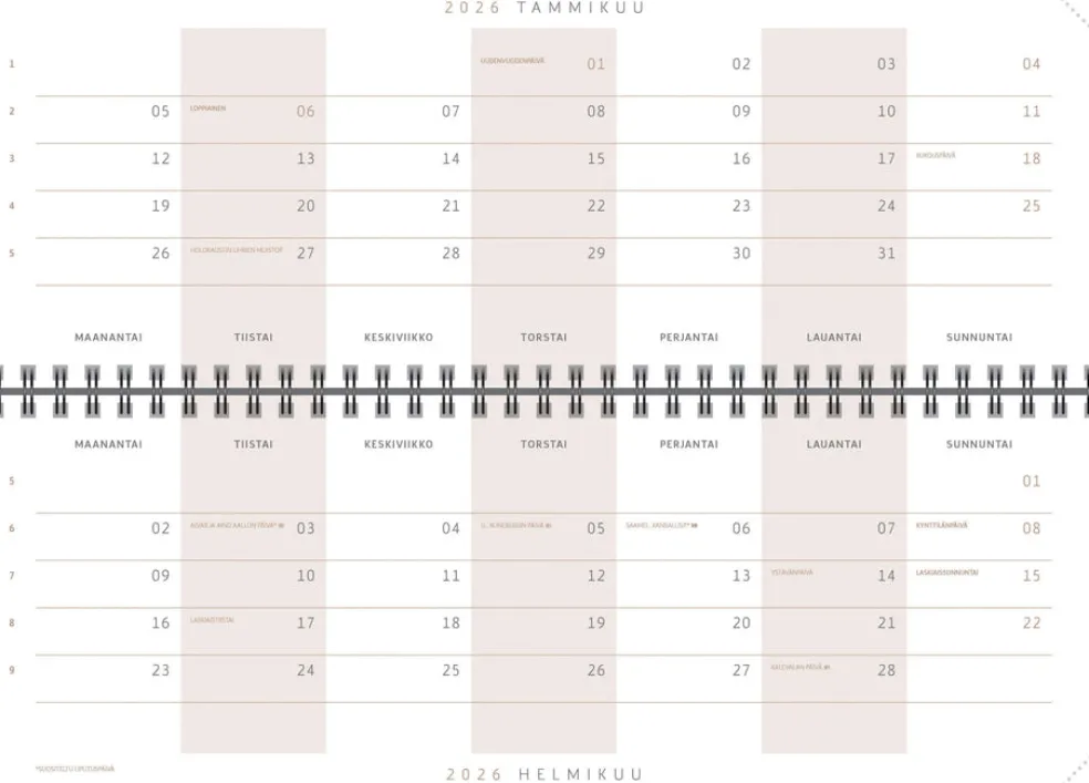 Koko 297 x 105 mm; parikierresidottu; vuosisuunnitelma 2026; päiväkirja 52/2025–53/2026; kansalliset vapaapäivät luettelona; muistiinpanosivuja; kangaskannet; FSC®-sertifioitu tuote.