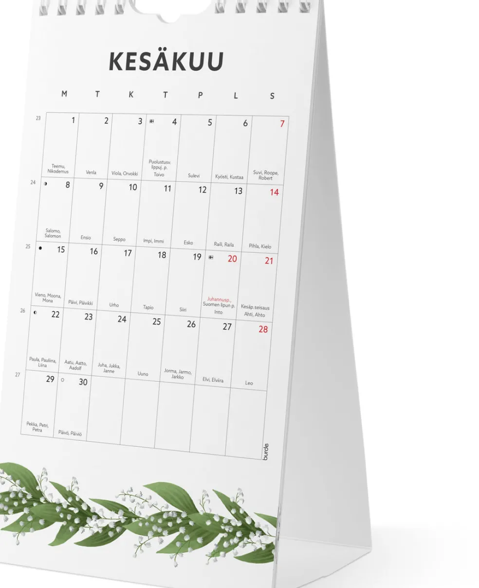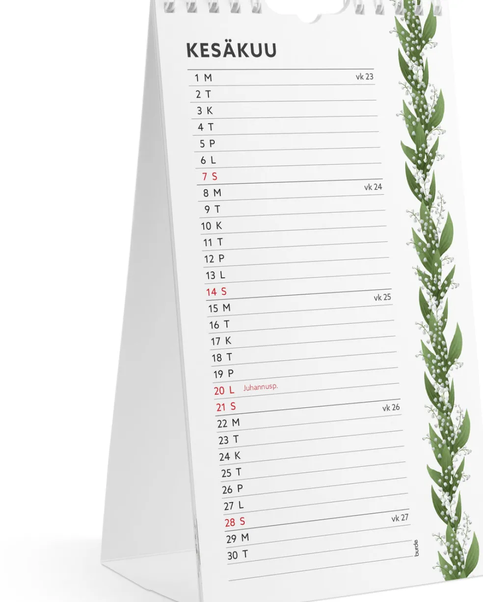 Pieni, helposti sijoitettava seinäkalenteri ja pöytäkalenteri yhdessä! Ripusta se seinälle tai taita pahvitausta ja aseta se pöydälle. Kaksi erilaista kuukausiaukeamaa näkyy samanaikaisesti joka kuukausi, kun se on pöydällä, joista toisessa on enemmän muistiinpanotilaa.Valitse haluamasi aukeama, kun ripustat sen seinälle.Kalenteri sisältää nimipäivät, liputuspäivät, juhlapyhät ja kuun vaiheet. Suomenkielinen. Parikierresidottu. FSC®. Koko: 120×215 mm.