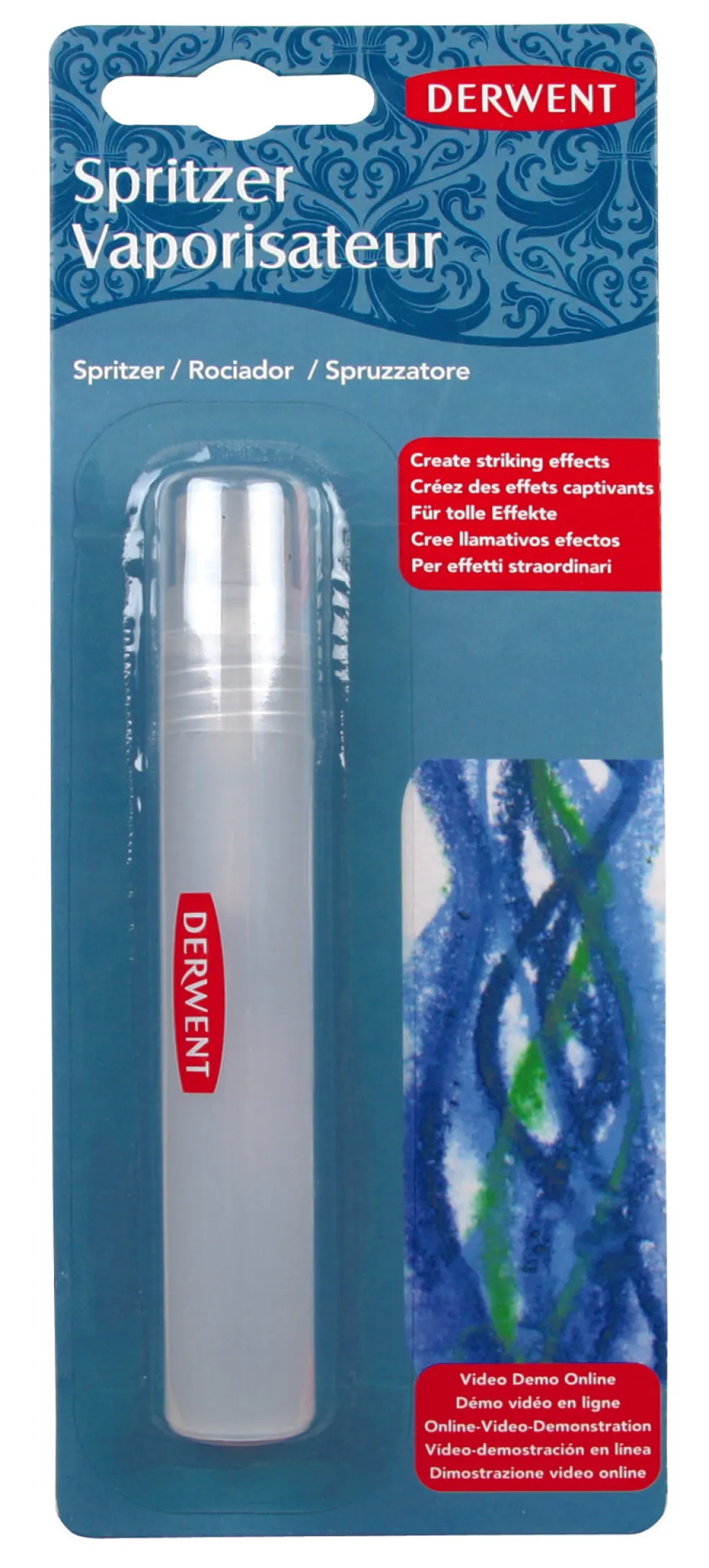 Suihkepullo lisää uuden luovan ulottuvuuden vesiliukoisten värien käyttöön. Suihkuta vettä suoraan vesiliukoisten piirustusten päälle luodaksesi mielenkiintoisia tekstuureja, värikulkuja ja tippuvia tehosteita. Voit myös liuottaa väripigmenttiä Grate ’n’ Shakeen (esimerkiksi Inktense tai Watercolor) täyttää Spritzerin ja suihkuttaa väriä suoraan kuvaasi. Monet taiteilijat myös suihkuttavat vettä kevyesti maalausten päälle säilyttääkseen työstettävän alueen märkänä.