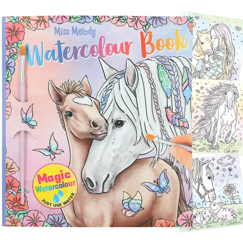 Vesivärihauskaa Miss Melody -kirjan parissa! Kostuta mukana tuleva pensseli vedellä ja maalaa sivun kuviot, ja saat esiin upeat värit! Hauskoja taianomaisia vesivärityshetkiä!