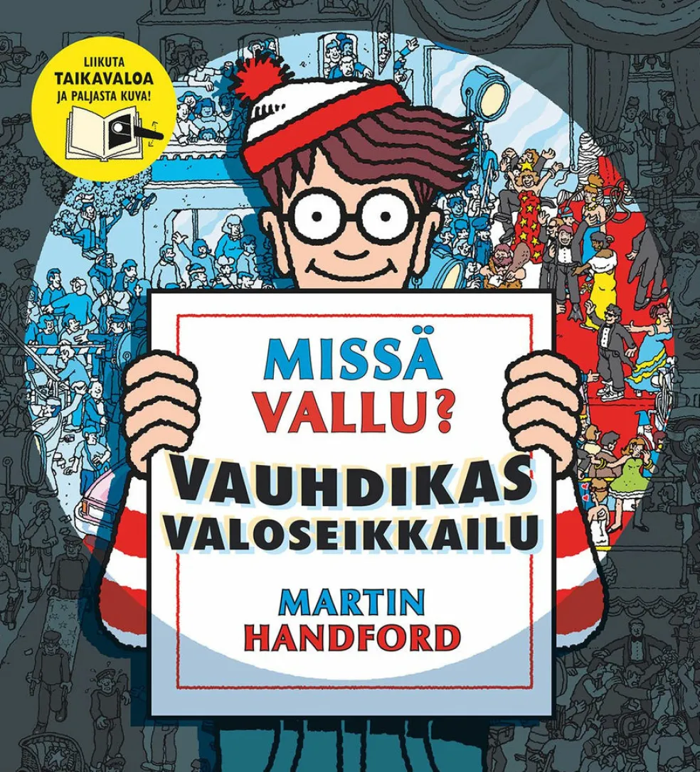 Huhuu, Vallun tarkkailijat – oletteko valmiita astumaan pimeälle puolelle? Uudessa ja odotetussa Vallu-etsintäkirjassa on pimennetyt kuvat, joita pystyy tutkimaan kirjassa olevan taikavalon avulla. Aloita siis valoseikkailu, josta ei puutu vauhtia eikä jännitystä! Viihdyttävät ja hupaisat kuvat vievät lukijan ulkoavaruudesta Hollywoodiin, merirosvojen luolaan sekä keskiyön villiin diskoon. Löydätkö Vallun, hänen koiransa Haukun, Venlan, Velho Valkoparran ja Vilperin sekä heidän tavaransa? Sujauta vain taikavalo sivun reunasta, niin himmeän hämyisät kuvat valostuvat!
