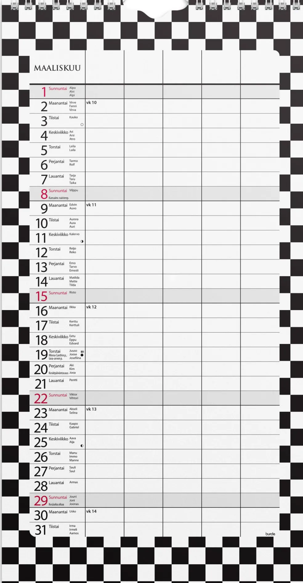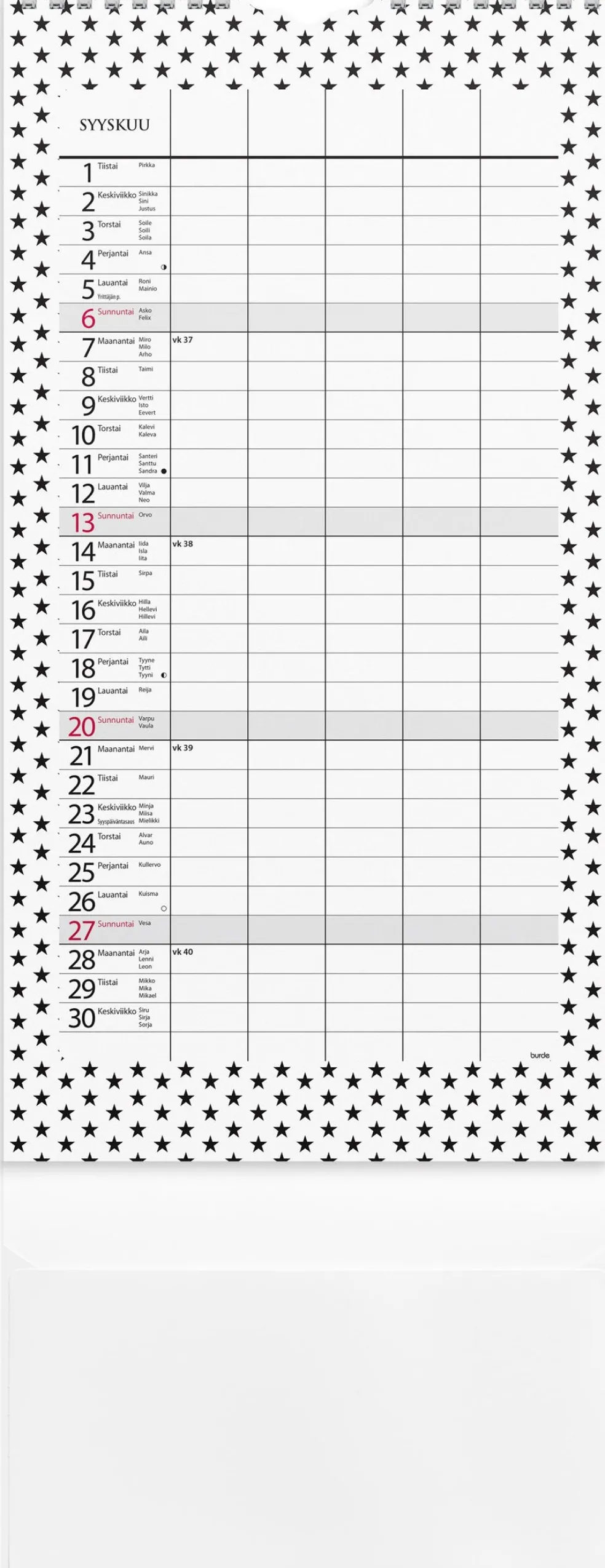 12 sivua. Moderni suunnitelmakalenteri viidellä sarakkeella. Kätevä paperitasku tärkeille papereille.. Kalenteri sisältää nimipäivät, liputuspäivät, kansalliset pyhäpäivät ja kuun vaiheet. Suomenkielinen. Parikierresidottu. FSC®. Koko: 220×430 mm (ilman paperitaskua).