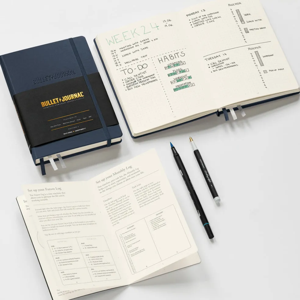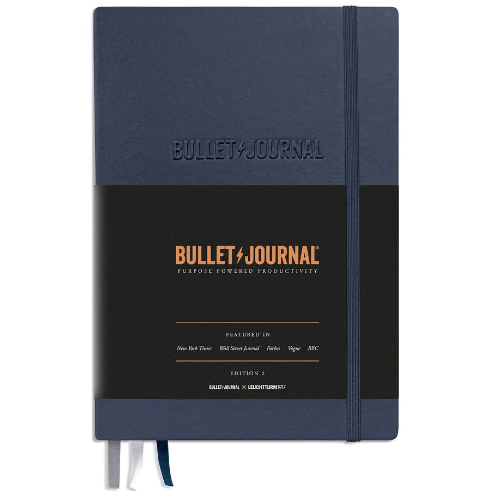 Leuchtturm1917:n Bullet Journal on täydellinen kumppani kaikille, jotka rakastavat järjestystä ja luovuutta. Tämä sininen muistikirja sisältää 206 pisteellistä sivua, jotka on valmistettu paksusta 120 gramman musteenkestävästä paperista, joten voit käyttää erilaisia kyniä ilman läpivuotoa. Sisältä löydät sisällysluettelon, kolme kirjanmerkkiä ja takakannen sisätaskun. Mukana tulee myös erillinen opas, joka auttaa sinua räätälöimään Bullet Journalisi tarpeidesi mukaan. Lisäksi saat ”ruudukko-oppaan” siistin asettelun luomiseen sekä tyylikkäitä tarroja kuukausille, päiville ja muille hyödyllisille symboleille.