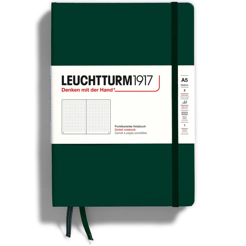 The classic A5 notebook with 80 g/m² FSC-certified and acid free paper and 251 numbered pages, where the last 8 pages are detachable. The size and range of colours make them ideal companions for all walks of life. You can choose the perfect notebook from a choice of several different colours. All notebooks have an elastic enclosure band, it is thread-bound to open flat, have two page markers, a gusseted pocket in the back and stickers for labelling and archiving. Color: Forest Green