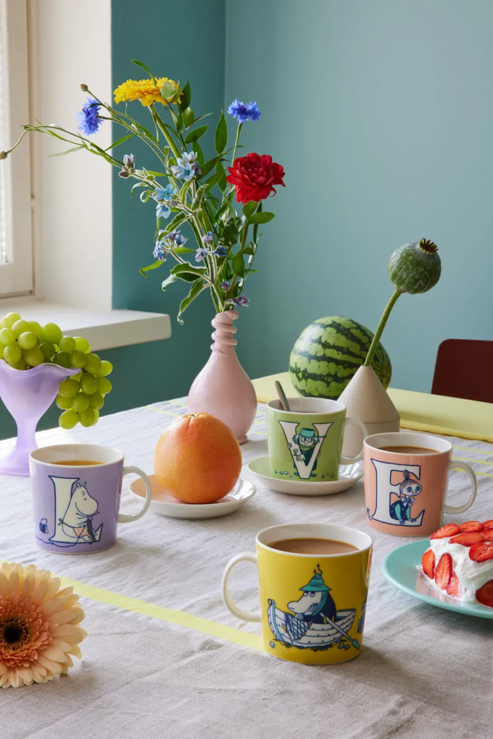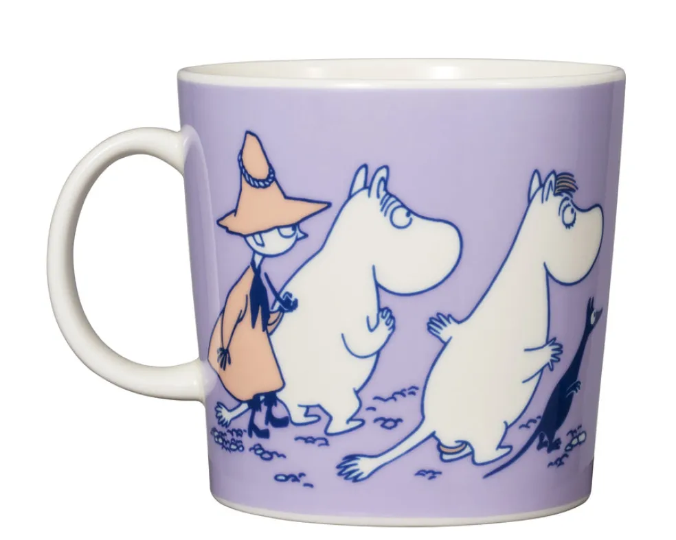 L-mukissa vaihtelunhaluiset Muumipappa ja Muumimamma muuttavat luolaan, mutta myöntyvät palaamaan, kun lapset löytävät heidät. ABC-kokoelmaan kuuluvan suuremman mukin kääntöpuolen kuvitus on saanut inspiraationsa “Muumiperhe”-sarjakuvasta. Moomin by Arabia, muki 0,4l, ABC L