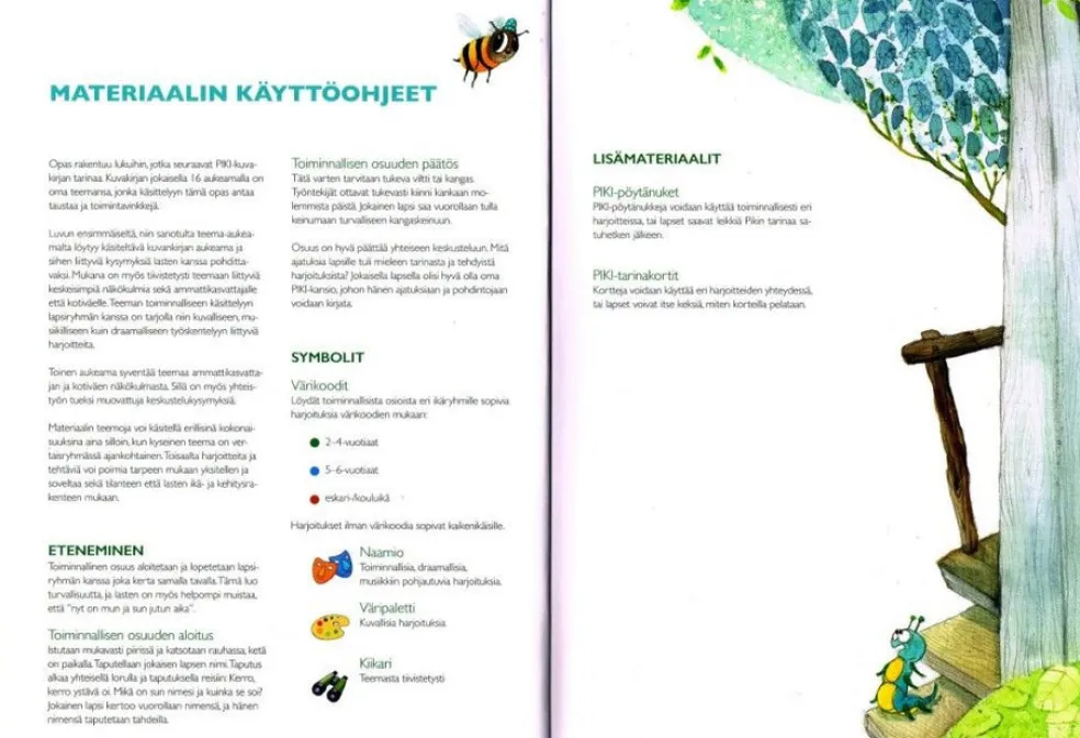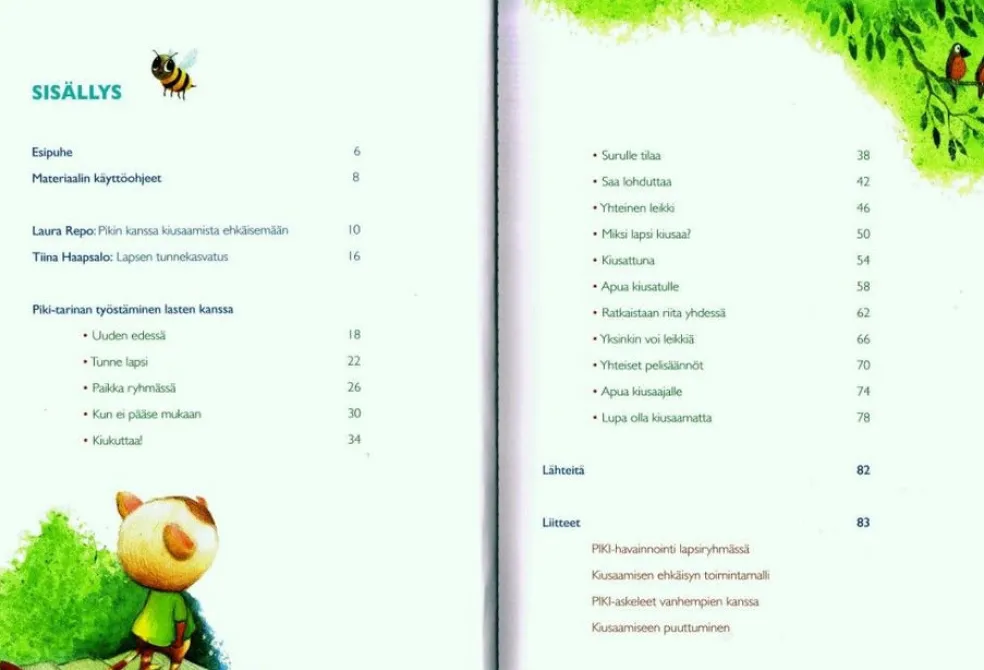 Opas muodostaa PIKI-kuvakirjan kanssa tärkeän työkalun kasvatuksen ammattilaisille. Teemakokonaisuuksina avautuvat aukeamat tarjoavat monipuolisen ja toiminnallisen tavan käsitellä kiusaamisen ehkäisyyn liittyviä tekijöitä lasten vertaisryhmissä. Tavoitteena on saavuttaa vanhempien ja muiden kasvattajien yhteistyönä kiusaamisen nollatoleranssi.