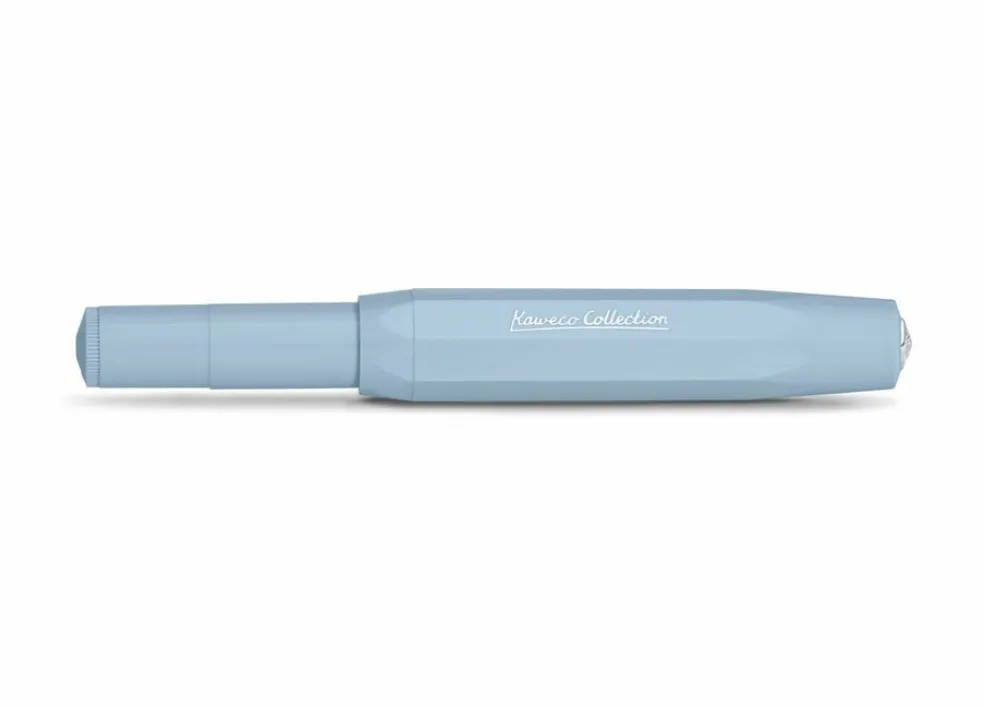 Tässä mustekynässä on: Kawecon vuonna 1911 luotu tunnuskuvio, kestävä makrolonmuovista valmistettu runko, hopeanvärinen kapea ruostumaton teräskärki, korkin päässä hopeanväristä metallia oleva Kaweco-logo. Mukana yksi sininen mustepatruuna.