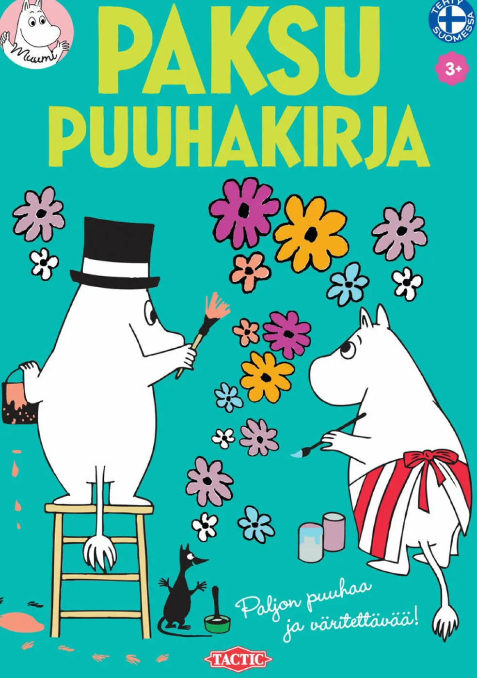 Minkä värisen kukkakimpun Muumipeikko kerää Muumimammalle? Löydätkö Nuuskamuikkusen uudesta laulusta karanneet nuotit? Suunnittele Hemulille uusi, upea postimerkki ja Muumimammalle kokoelma erivärisiä laukkuja. Värityskuvat ja puuhapulmat pitävät luovuutta yllä ja hoksottimet terävinä. Värikkäitä hetkiä ja puuhakkaita tuokioita! Muumien paksussa puuhakirjassa on paljon tekemistä – 96 sivua! Mukana kaikki Muumilaakson rakastetuimmat hahmot Pikku Myystä luisevaan Vilijonkkaan.