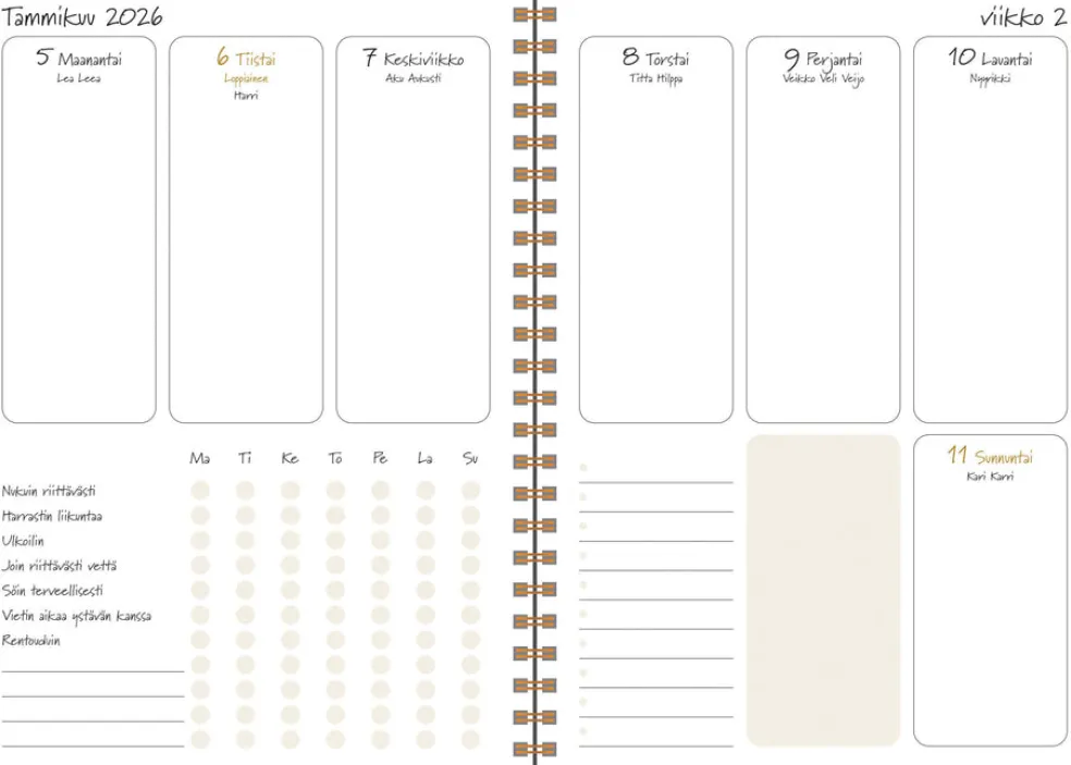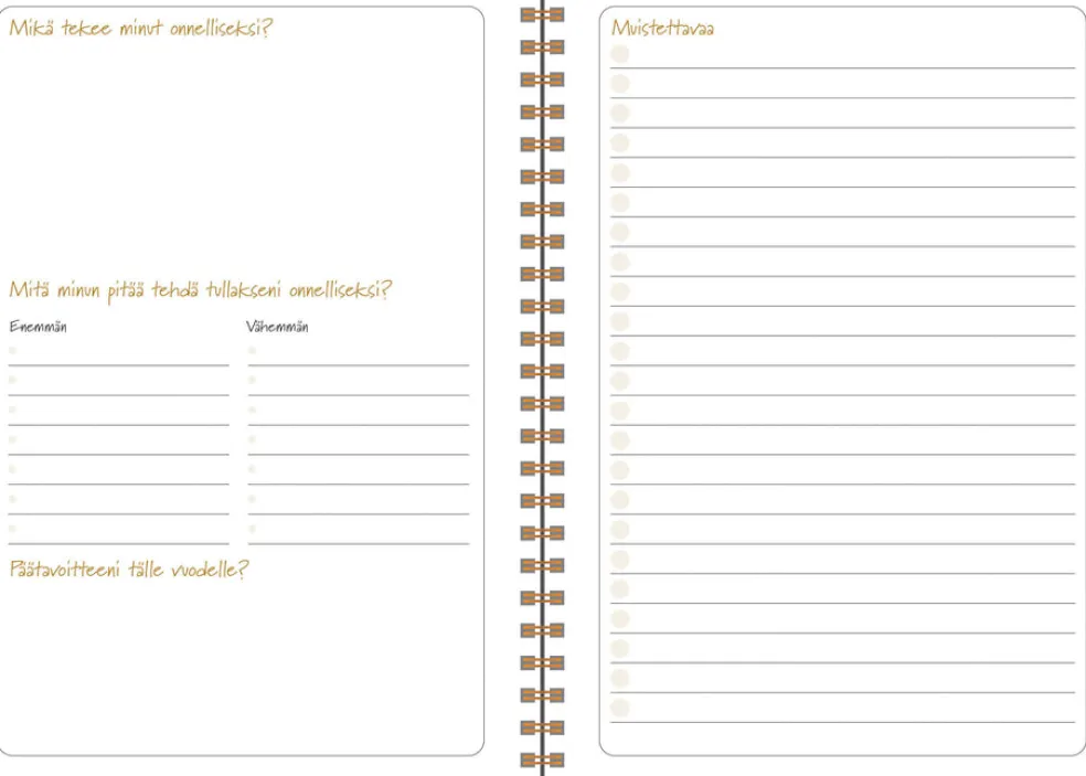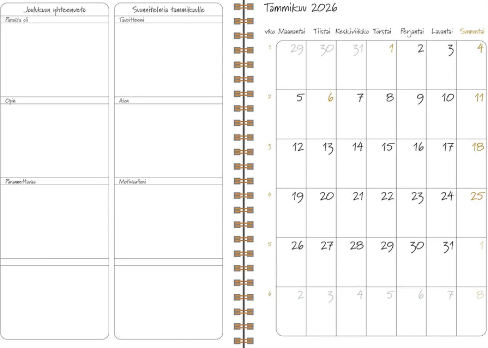 Koko 148 x 210 mm (A5); parikierresidottu; tukevat kartonkikannet; hyvinvointiin kannustava selkeä viikkonäkymä; päiväkirja 52/2025 – 1/2027; vuosisuunnitelmat 2026 ja 2027; joka kuukauden alussa kuukausisuunnitelma-aukeama; liputuspäivät Suomessa; suomenkieliset nimipäivät; budjettiseurantasivuja; muistiinpanosivuja; tarra-arkki; paperitasku takakannessa; FSC®-sertifioitu tuote.